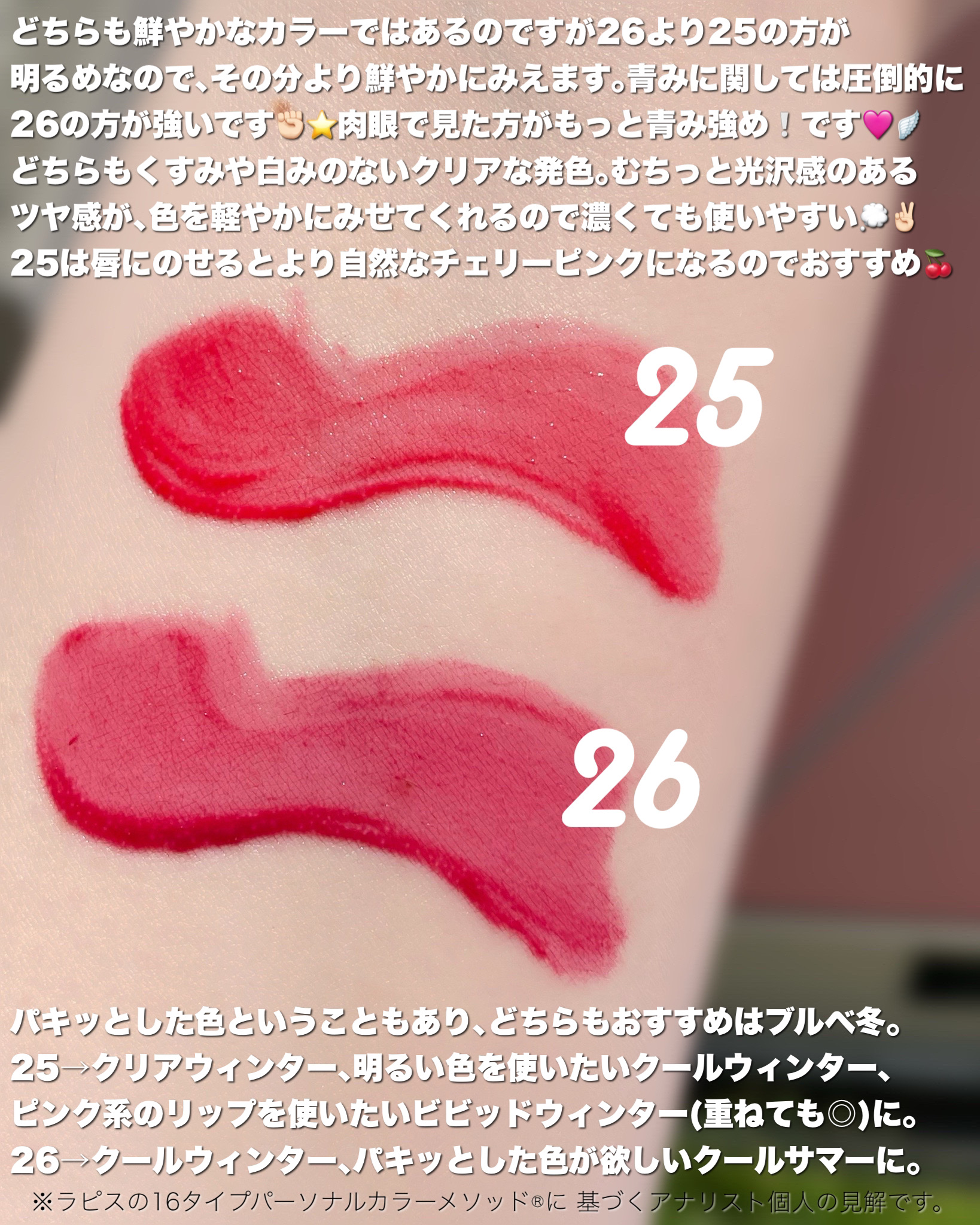 ブルベ冬におすすめの落ちないリップ4選🌹ブルベ冬さんは、ワインレッドやバーガンディ、ベリー系のピンクを選ぶのがおすすめ◎青み寄りで深みや鮮やかさのある色が肌を明るくきれいに見せてくれる🎀パキッとした赤リップが似合うのはブルベ冬の特権!✨❤️v...