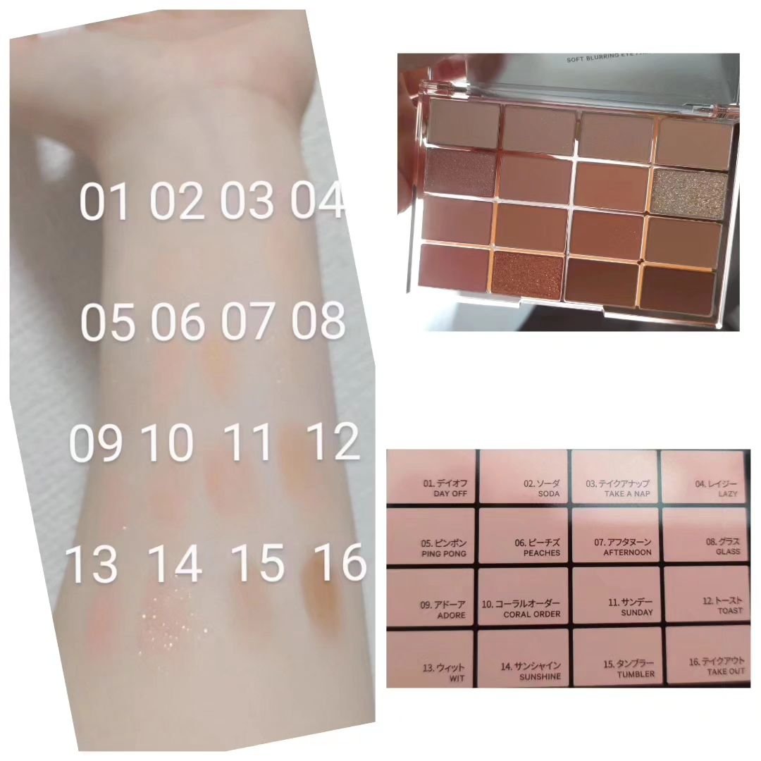 - 多彩なパーソナルカラーを基盤に作られたソフトブラーリングアイパレットで、16色を入れる事で、パレット1つでどんなメイクにもチャレンジできる形状が細長く持ち運びにも便利なパレット。 目元にやさしい使用感で広がり粉の飛び散りが少なく、しっかりと密着し染み込むように自然に馴染むテクスチャーが特徴。
