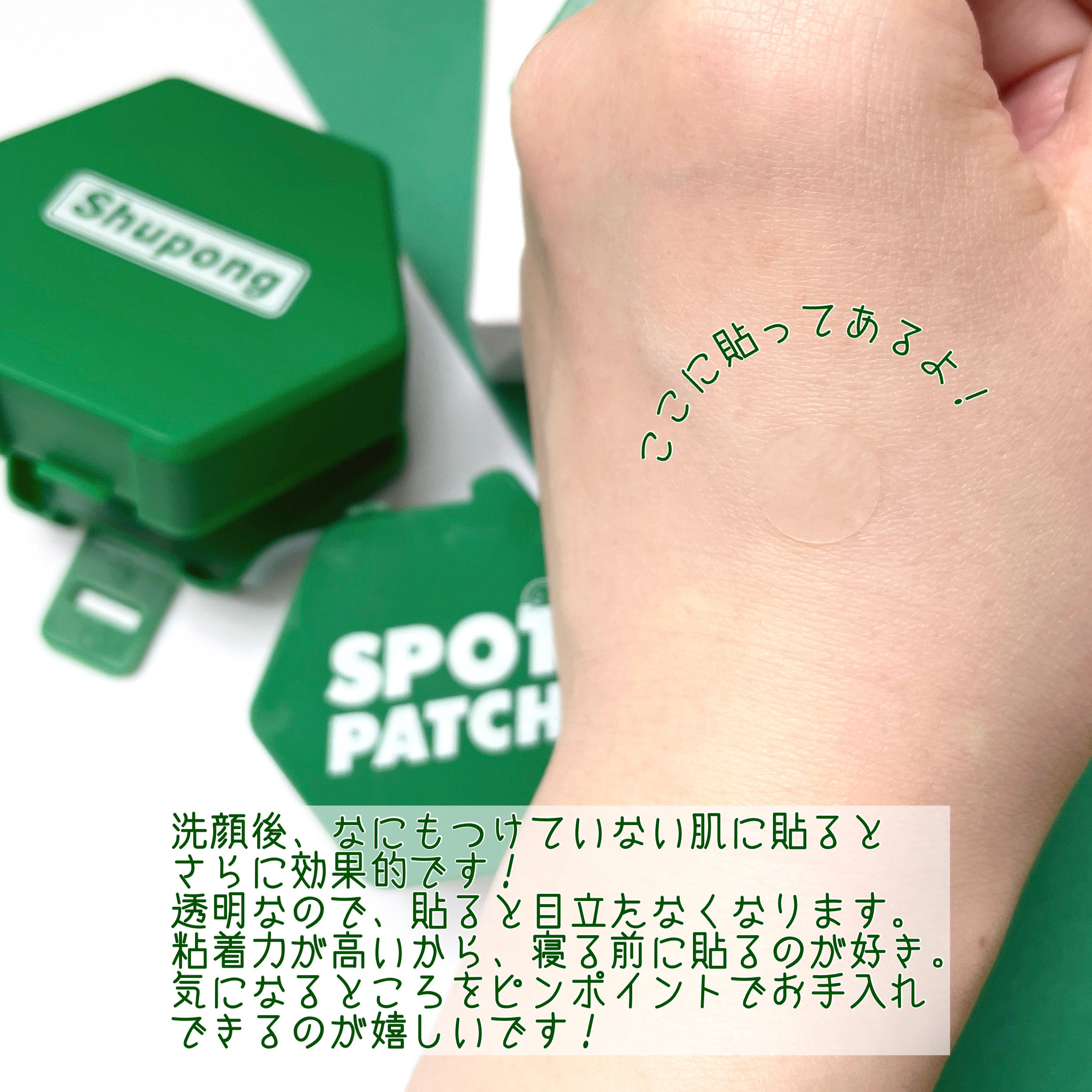 ニキビが潰れてしまった後に貼る、ニキビパッチです! 私は夜のスキンケアが全部終わって、ベタベタしなくなった後に貼っています! 密着力が高くて、朝になっても剥がれてなかったので、お気に入りです! 鍼がついているニキビパッチで、よりしっかりケアしたい方におすすめです!