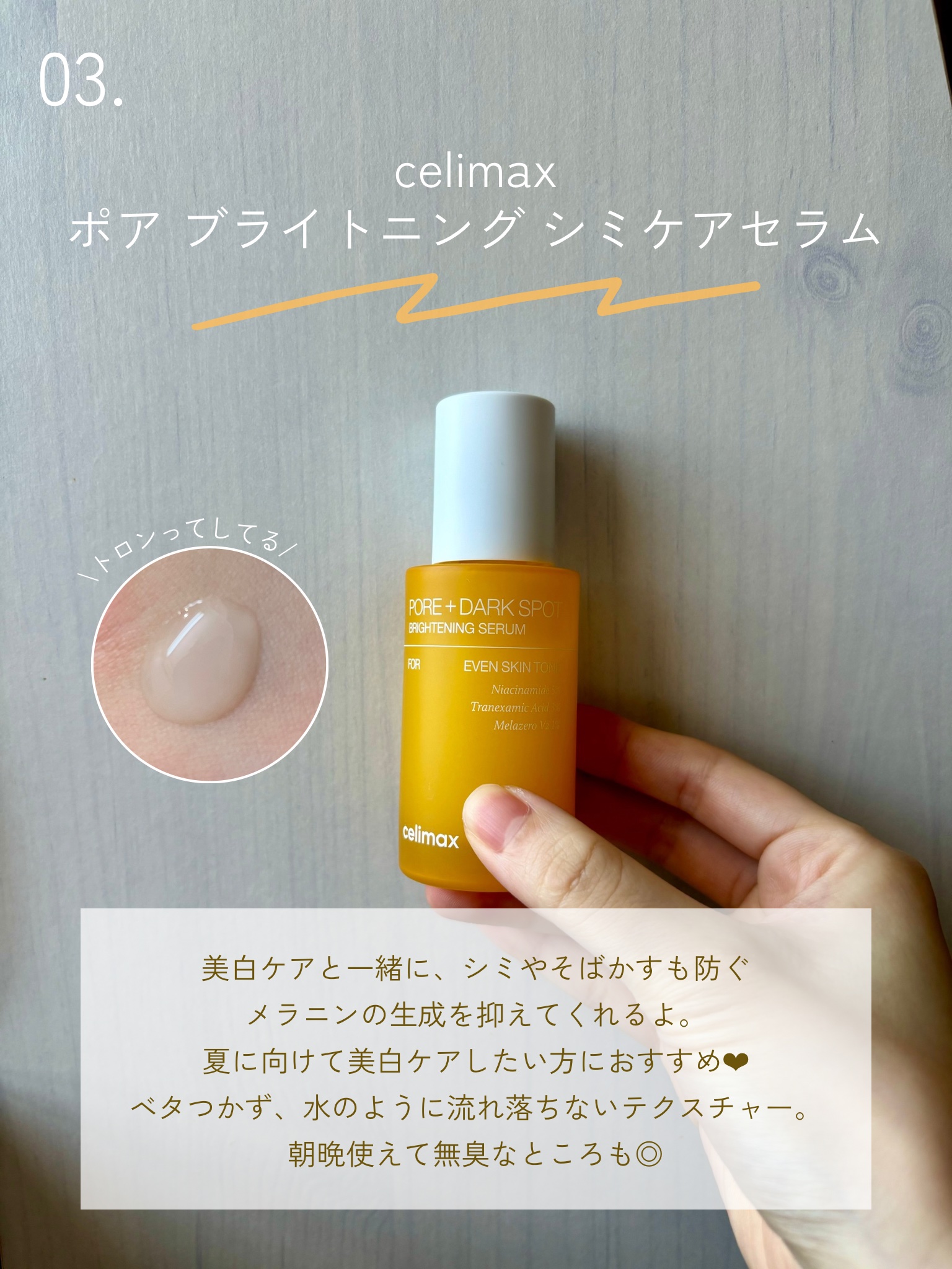 特におすすめなのは、SKIN1004のセンテラアンプルと celimaxのシミケアセラム! どちらも刺激が少なく初心者さんにもおすすめ。さっぱりとしたテクスチャーだから夏の季節にもぴったりだよ〜🩵 どの美容液も優秀でコスパが良いから、ぜひ1度試してみて欲しい🥺
