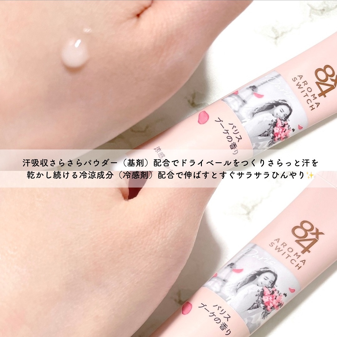 - 首のベタつきを抑え、髪の張り付きを防ぎます 汗が気になるたび、新鮮な香りがはじけてさらっと涼やか ●ジェルが肌をまもって整えます ●汗吸収さらさらパウダー(基剤)配合 肌になじんでドライベールをつくり、さらっと汗を乾かし続けます ●冷涼成分(冷感剤)配合 汗に反応して、ひんやりします ●汗が気になるたび香りが再発香(*2) 汗が気になるたび、新鮮な香りがはじけてあなたを包みます (*2)機能性香料によるカバーリング効果 ●摩擦に強く落ちにくいこすれプルーフ処方 ●携帯に便利なサイズ。約50回使えます ●海外の都市やシーンをイメージした3種類の香り いずれもエッセンシャルオイル配合(香料中)。 パリスブーケの香り:みずみずしいピオニーにペア一の甘さをプラス。大切な人から花束をもらった幸せな瞬間をイメージした香り