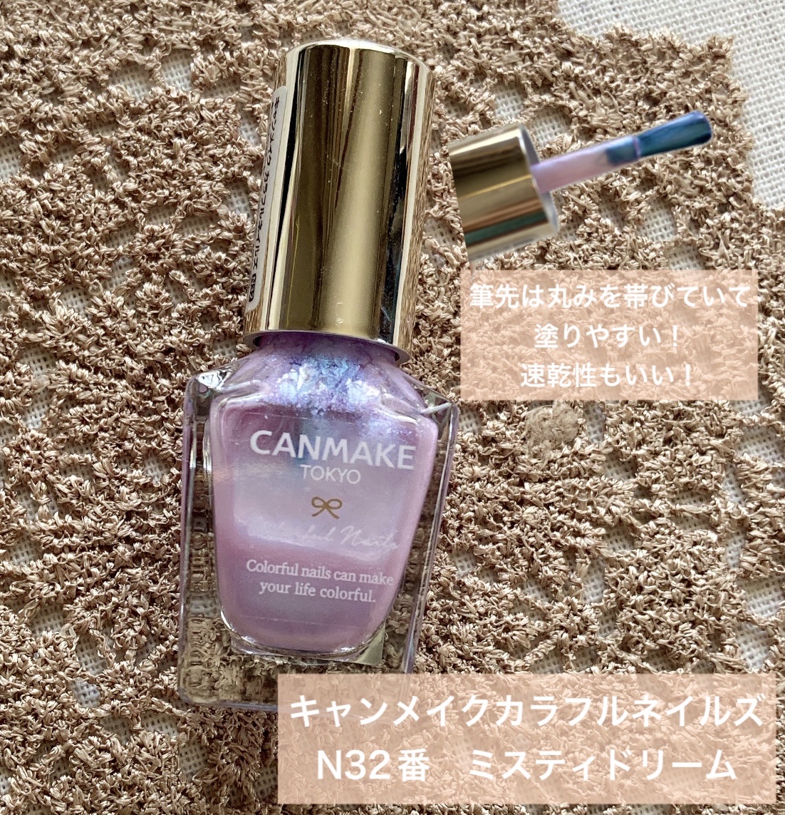 コスパもカラー展開も一押しなキャンメイクのネイルポリッシュのご紹介! 薄めのパープルの色を基調としたポリッシュにブルー系の偏光パールがキラキラとしていてゆめカワを体現したようなカラーが可愛すぎる…! 絶妙な色合いがたまらないネイルポリッシュでした!