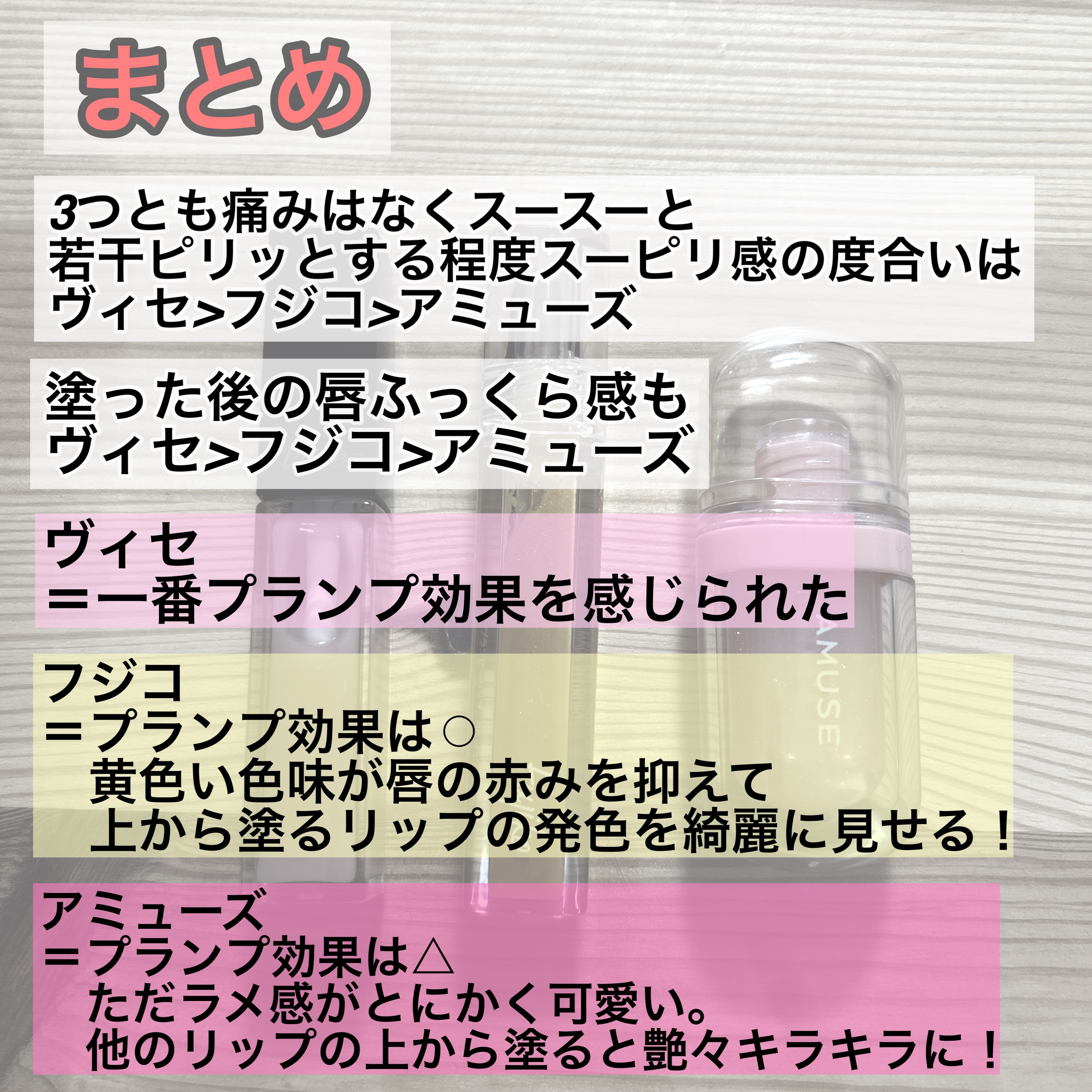 ツヤ感+スパチュラ形状で使いやすいリッププランパー。【使った商品】AMUSEリップフラー(リッププランパー)【使用感】ピリピリではなくスースーするタイプのリッププランパー。ミント系のリップクリームを塗った時のような感じで痛みはありません。塗る...