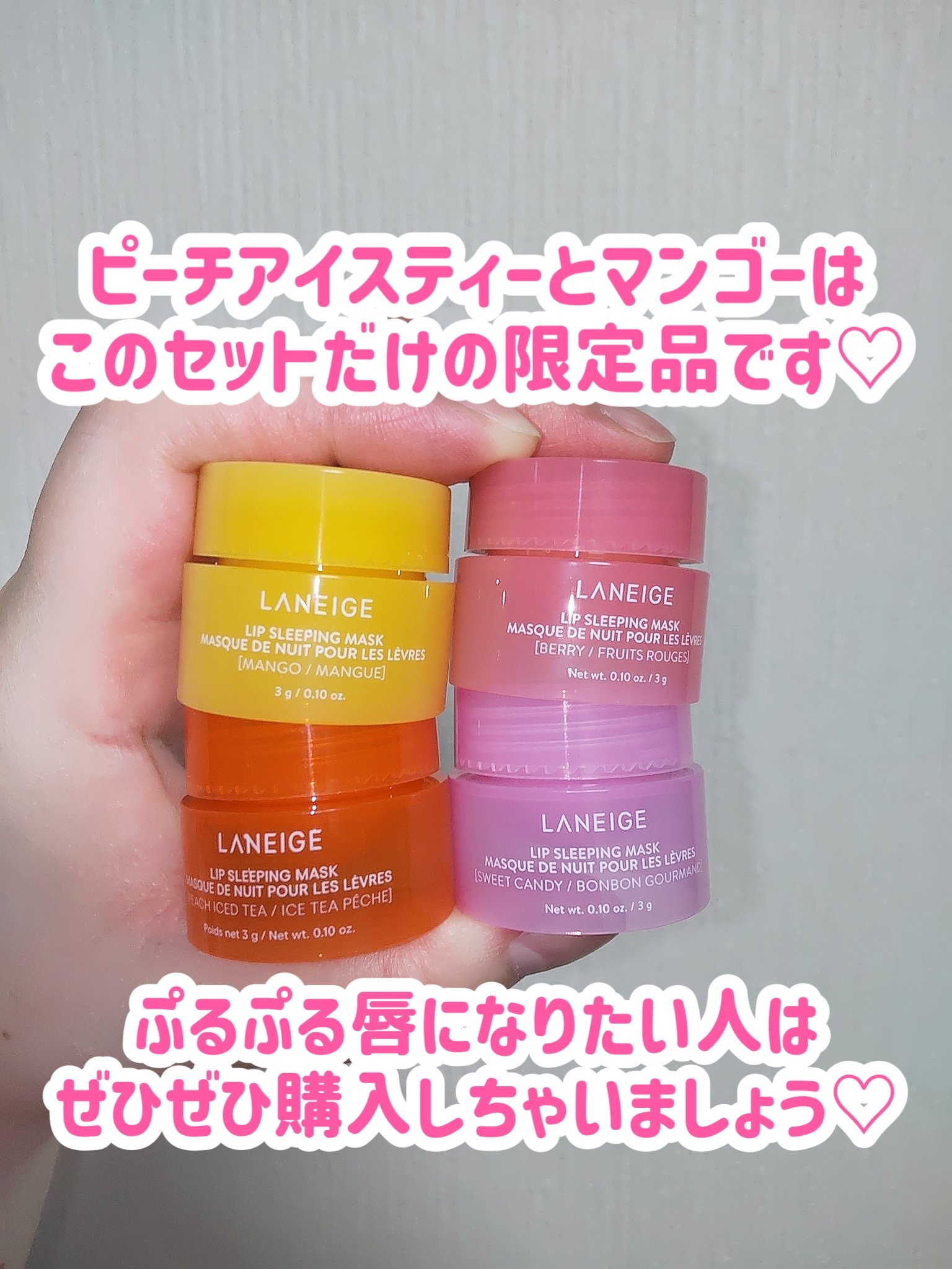 夜寝る前につけるリップケア商品が欲しくて、ずっと気になっていたこちら⬆️ ドリーミーリップキットは、【限定フレーバー】のマンゴー【限定フレーバー】のピーチアイスティースイートキャンディマンゴーが入った、リップスリーピングマスクミニサイズのスペシャルキット🌈 こういうアソートパックみたいなの大好物です😍