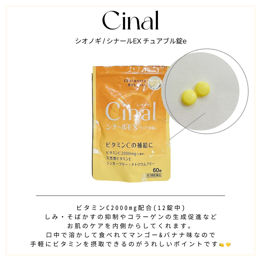 ビタミンCは体内で作ることができないので食事やサプリで摂る必要があります、けど、水溶性なので体内に吸収されて溶けてしまうので継続的に1日何度も摂取する必要があるので続けやすい価格で飲みやすいものが絶対条件です。 DHC 持続型ビタミンCは価格が安くて続けやすい、錠剤が小さくて飲みやすい🍊 シナールEXチュアブル錠は水無しでラムネのように摂取できるので続けやすいし飲みやすい。ビタミン2000mgなので美容にも良い。