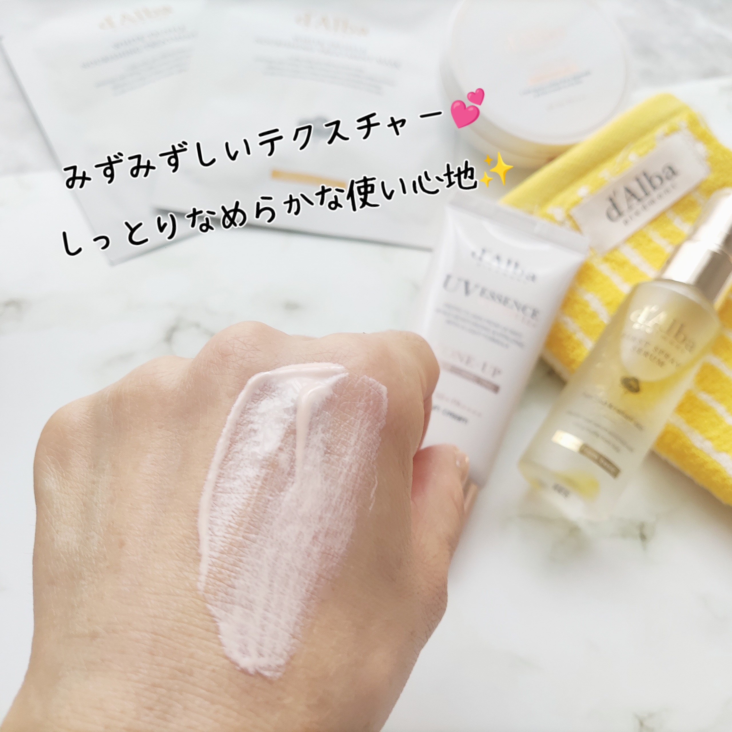 肌トーンを選ばず、素肌みたいに 自然にトーンアップ*できるUVクリームです。 SPF50+ PA++++あるので、 紫外線が強くなるこれからにも ぴったりだよね~😉 クリームはみずみずしいテクスチャー。 白浮きもしないし、 上品な陶器肌を演出してくれるよ◎ どちらかというとツヤのある しっとりとした使い心地。 ダルバのUVクリームを塗っておくと 艶っぽいメイクをキープできるのも良いね🥰 この1本あれば、色ムラや気になる毛穴も… いろんな肌悩みをケアしてくれるよ◎ 日焼け止めいらずで コスパもいいよね😊🤍 紫外線が強くなるこれからの季節にも 重宝しそうです。