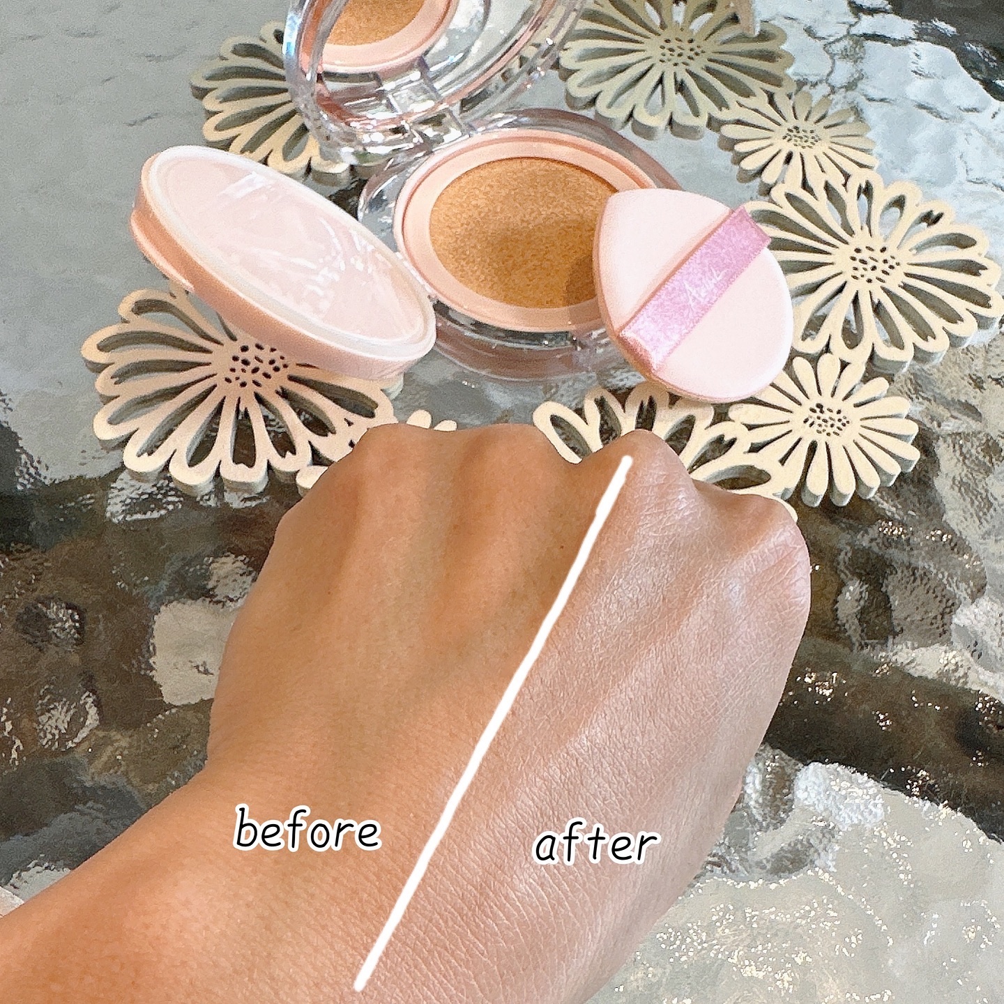 インクのように肌になじみ、シミや不規則な肌トーンを補正インクが染まるように肌のキメの間に入り込み、まだらな肌トーンをコンシーラーレベルのカバー力で、一気に明るくしてリタッチが不要な持続力の強い、クッションファンデーション😀 微細なシリカパウダーと、光を反射するパールパウダーが毛穴とデコボコをカバーしてシリコンゲル成分が毛穴を埋めてツヤ光肌を演出してくれます。 ハイカバー過ぎない所とツヤが合わさってまるで自分の肌のような自然な仕上がりでした🤗