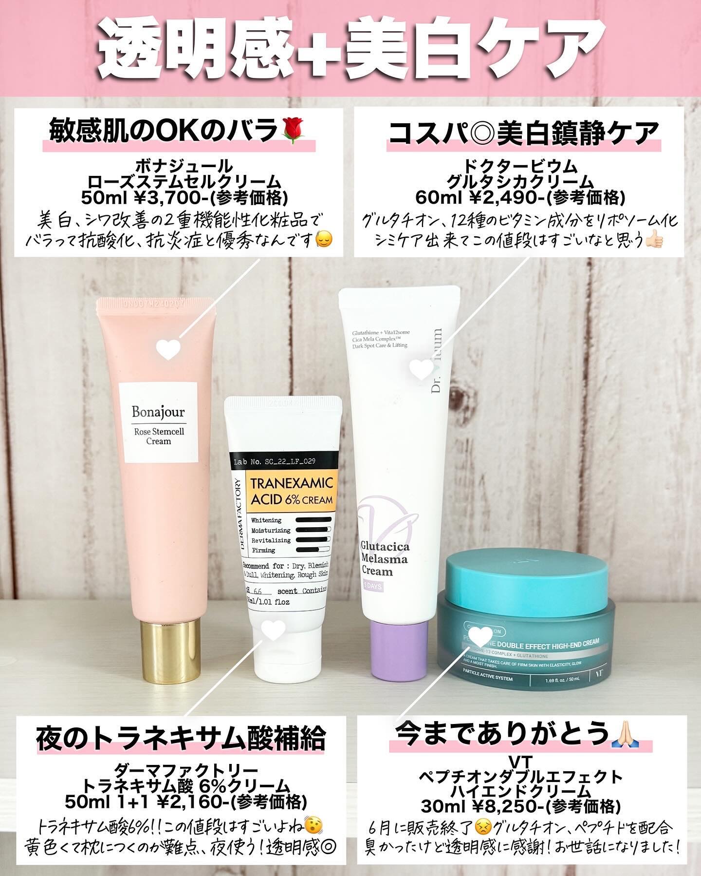 ドクダミ🌿とシラカバ🤫🩵 昔から出てたドクダミ美容液は配合成分がシンプル トラネキサム酸配合の新作かな☺️ 正直、桃セラム🍑も使用感はすきなんだけど ビタミンCはトラネキサム酸に比べて 透明感を感じるのが私は早いです!