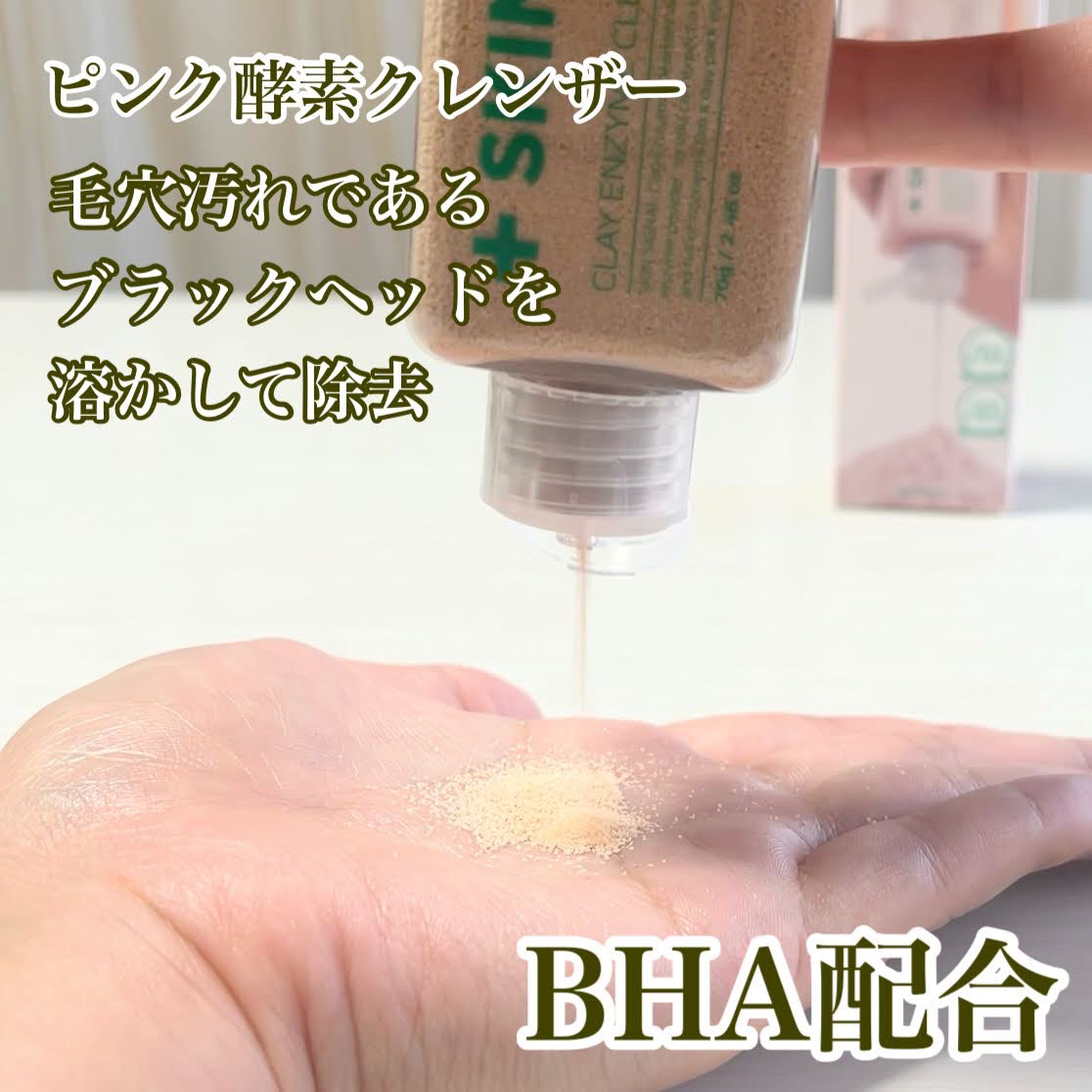 クレイが配合されていてお肌の汚れを吸着しながらすっきりオフしてくれます。 ピンクのクレンザーにはBHA(サリチル酸)が配合されていて毛穴の汚れやブラックヘッドのケアにぴったり。 水だけに溶かすと、酵素とクレイ成分でパック使いもできるので1本あると便利スキンケアでした!