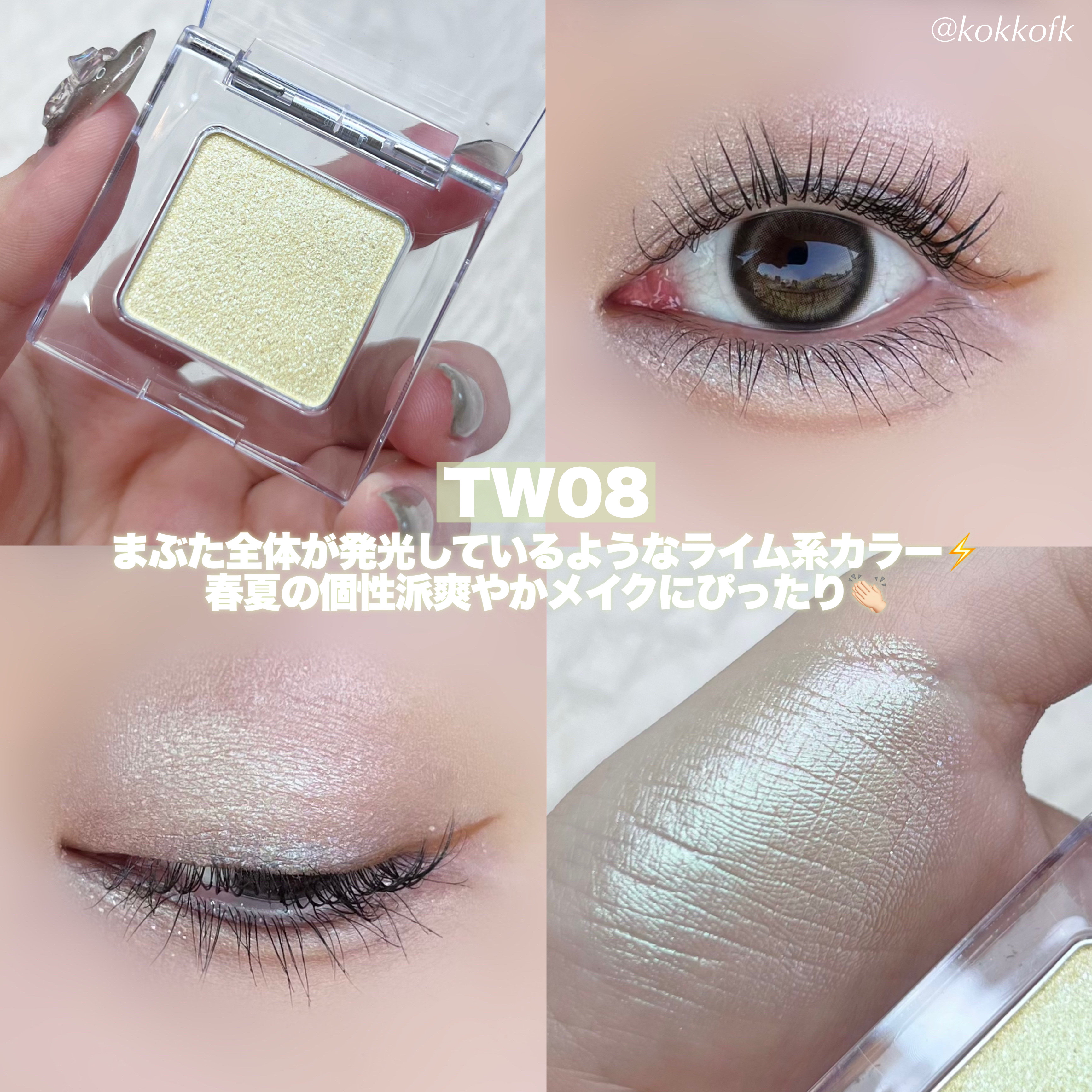- 9つの質感に秘められた無限の可能性を持つカラーバリエーション。 【トゥインクル】 まるでヴェールのように、極小の光の粒がまぶたを包み込み、上品な華やかさをプラスしてくれるトゥインクル。 ポイント使いをすれば、自然で上品なツヤ感に。普段のメイクのニュアンスチェンジにも活躍します。