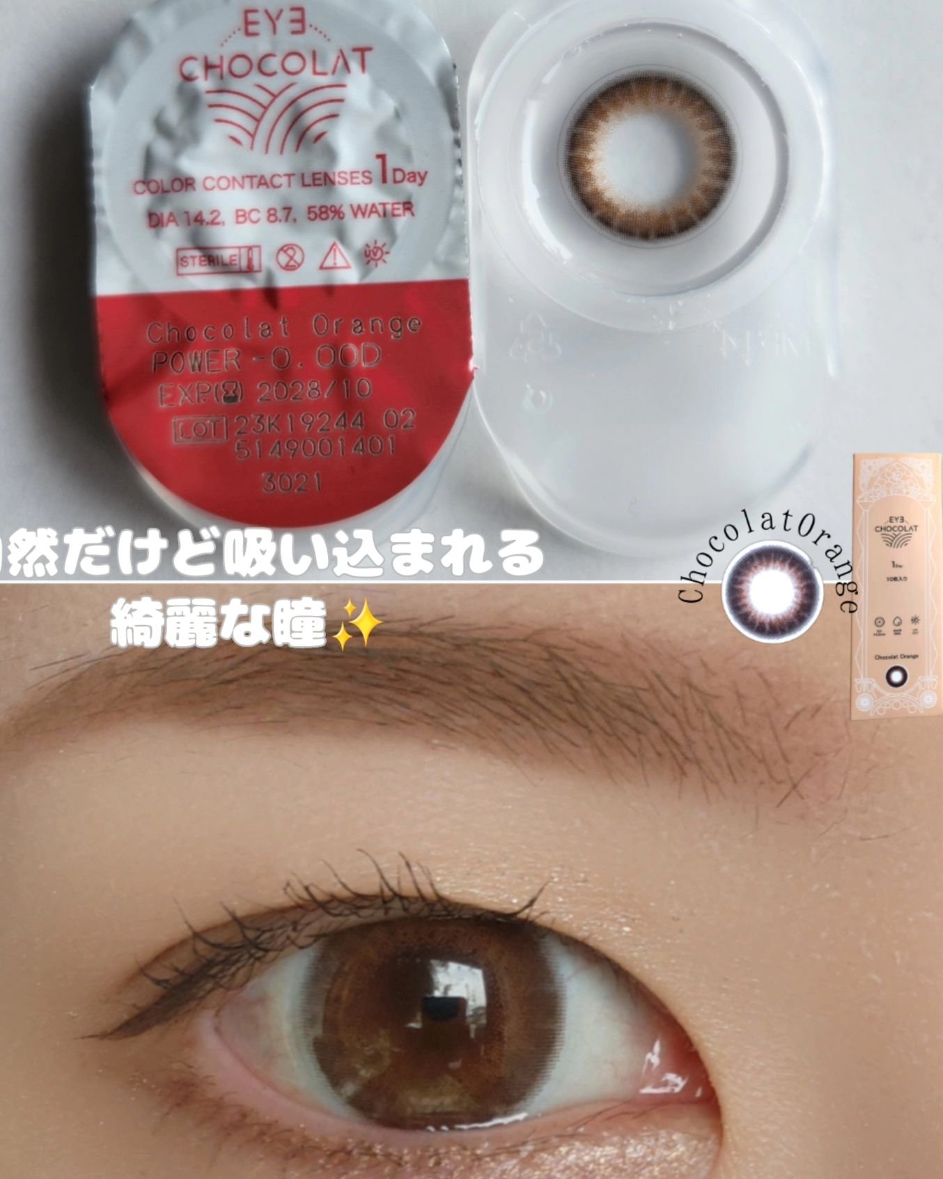 - アイショコラ(EYE CHOCOLAT)は目元の魅力を際立て、新しい美しさを発見するための魅力的なカラーコンタクトブランドです。 高含水率58%レンズで、柔らかくうるおいたっぷり。装用時に違和感が少なく、瞳に優しい使用感です。酸素透過性の高いレンズです。 注意事項 コンタクトレンズは⾼度管理医療機器です。必ず眼科医の検査・処⽅を受けてお求めください。 また、ご使⽤前に必ず添付⽂書をよくお読みになってから正しくご使⽤ください。 ■コンタクトレンズは高度管理医療機器です。取り扱い方法を守り正しくご使用ください。 ■眼科医院等にて検査を受けてからお求めください。 ■眼に異常を感じたら直ちにレンズ使用を中止し、お近くの眼科等で検査を受診してください。 ■ご使用の前に必ず添付文書をお読みください。 ※装用のイメージは個人差がございますので、ご注意ください。