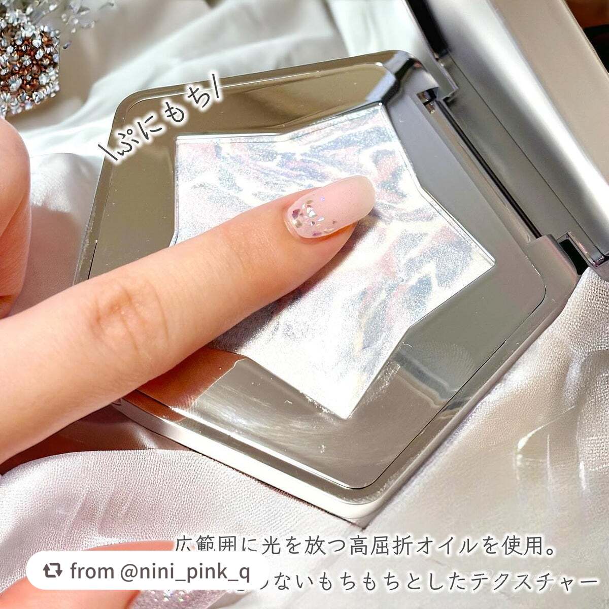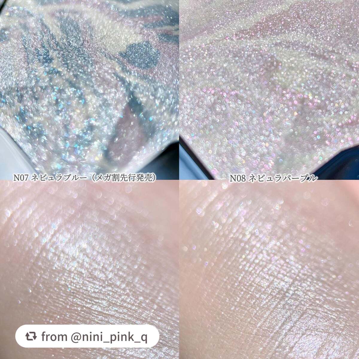 - 「ダイヤモンドのような輝き」天の川のように輝く、透明感と輝きに優れた真珠のような光沢。 複数のファインダイヤモンドの輝きを再現 <01 シルバーホワイト> シルバーホワイトのカラーが美しく輝いてツヤと透明感をプラス。なめらかでモチっとしたテクスチャーと小粒のラメが美しいツヤ肌を演出。Tゾーンや頬骨、デコルテなど光を与えたい部分に塗ればダイアモンドのように輝く。 <02 ライトシャンパン> ライトシャンパンのカラーが血色感と自然な光沢感をプラス。なめらかでモチっとしたテクスチャーと小粒のラメが美しいツヤ肌を演出。Tゾーンや頬骨、デコルテなど光を与えたい部分に塗ればダイアモンドのように輝く。 <03 シャンパンゴールド> シャンパンゴールドのカラーが表情を華やかに引き立てる。なめらかでモチっとしたテクスチャーと小粒のラメが美しいツヤ肌を演出。Tゾーンや頬骨、デコルテなど光を与えたい部分に塗ればダイアモンドのように輝く。 <05 シャンパンピンク> シャンパンピンクのカラーが血色感と透明感を与える。チークに重ねればピンクが引き立つ!なめらかでモチっとしたテクスチャーと小粒のラメが美しいツヤ肌を演出。Tゾーンや頬骨、デコルテなど光を与えたい部分に塗ればダイアモンドのように輝く。 <N01 シルバーホワイト> シルバーカラーのきらめきで、一瞬で透明感ある印象に。 小粒パール+大粒グリッターの組み合わせが、星屑のように繊細かつ大胆に煌めいてワンランク上のメイクに仕上げる。なめらか&モチっとした使用感で肌に高密着。 光を反射させる高屈折オイル配合でどの角度でもツヤ肌を実現。 鼻・頬・目頭・眉下以外にも、肩やデコルテに仕込めばお顔のツヤとリンクして、内から輝くような自然な印象に。 <N02 ライトシャンパン> ライトシャンパンのカラーが肌の色に自然になじみながら、ほどよいツヤと立体感をプラス。 小粒パール+大粒グリッターの組み合わせが、星屑のように繊細かつ大胆に煌めいてワンランク上のメイクに仕上げる。 なめらか&モチっとした使用感で肌に高密着。光を反射させる高屈折オイル配合でどの角度でもツヤ肌を実現。 鼻・頬・目頭・眉下以外にも、肩やデコルテに仕込めばお顔のツヤとリンクして、内から輝くような自然な印象に。 <N07 ネビュラブルー 日本限定色> ブルーとパープルの大粒ラメと、細かいシルバーラメが混ぜ合わさって色白な肌にツヤ感を与えてより明るく見せることができる! <N08 ネビュラパープル 日本限定色> パープルとピンク色の大粒ラメと、細かいシルバーラメが混ぜ合わさって、どのような肌色にもぴったり!かわいらしい雰囲気が作れる。