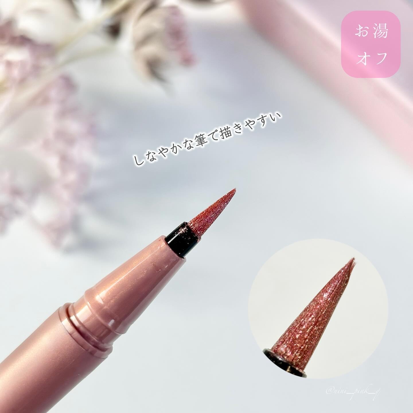 繊細なラメが魅力的な透け感あるラメライナー🥹♡ バチバチに派手になるわけではなく、ナチュラルに馴染むから誰でも普段使いできる。 とにかく色味が可愛い。お湯落ちなのに水や汗に強いから長時間のメイクにも良いよ〜✌🏻 色味とラメ感が可愛いんだあ。切開ラインが私は似合わないけど目頭の内側?はいけるから、このライナーぴったりかも。