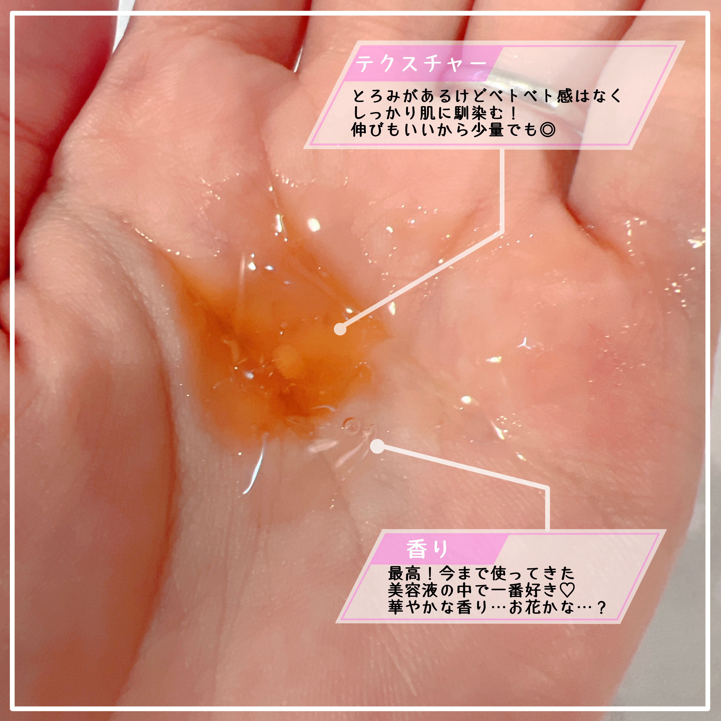 肌に合うかもわからないのに高いの買うのなー… と、長年買うのを躊躇していたので お試しができてとっても嬉しかったです🥺🥺 よく口コミで匂いが苦手ってゆうのを見たことがあるので、しっかり匂いを嗅いでみました🧐 確かに独特な匂いしてます😦 テクスチャーはすごくサラサラすぎて動画撮る時に指の隙間からポタポタ垂れてしまって もったいない!!!と思いながら撮ってました😭