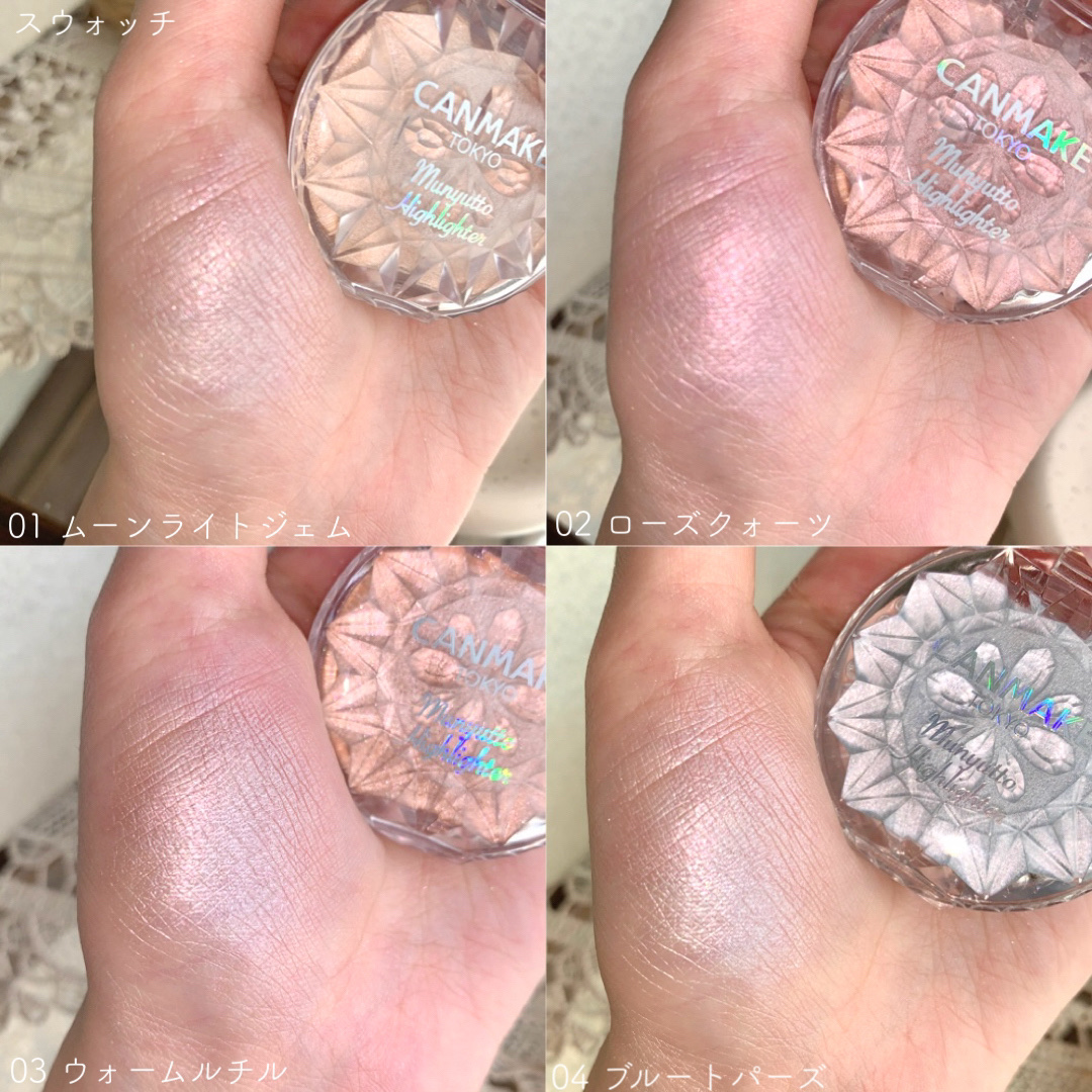 キャンメイクむにゅっとハイライター全色比較繊細なラメがたくさん入った、密着度の高いハイライト‼️01ムーンライトジェム一般的なハイライトカラーホワイトベージュって感じかな?パーソナルカラー関係なく使える!02ローズクォーツピンクハイライト🎀💕...