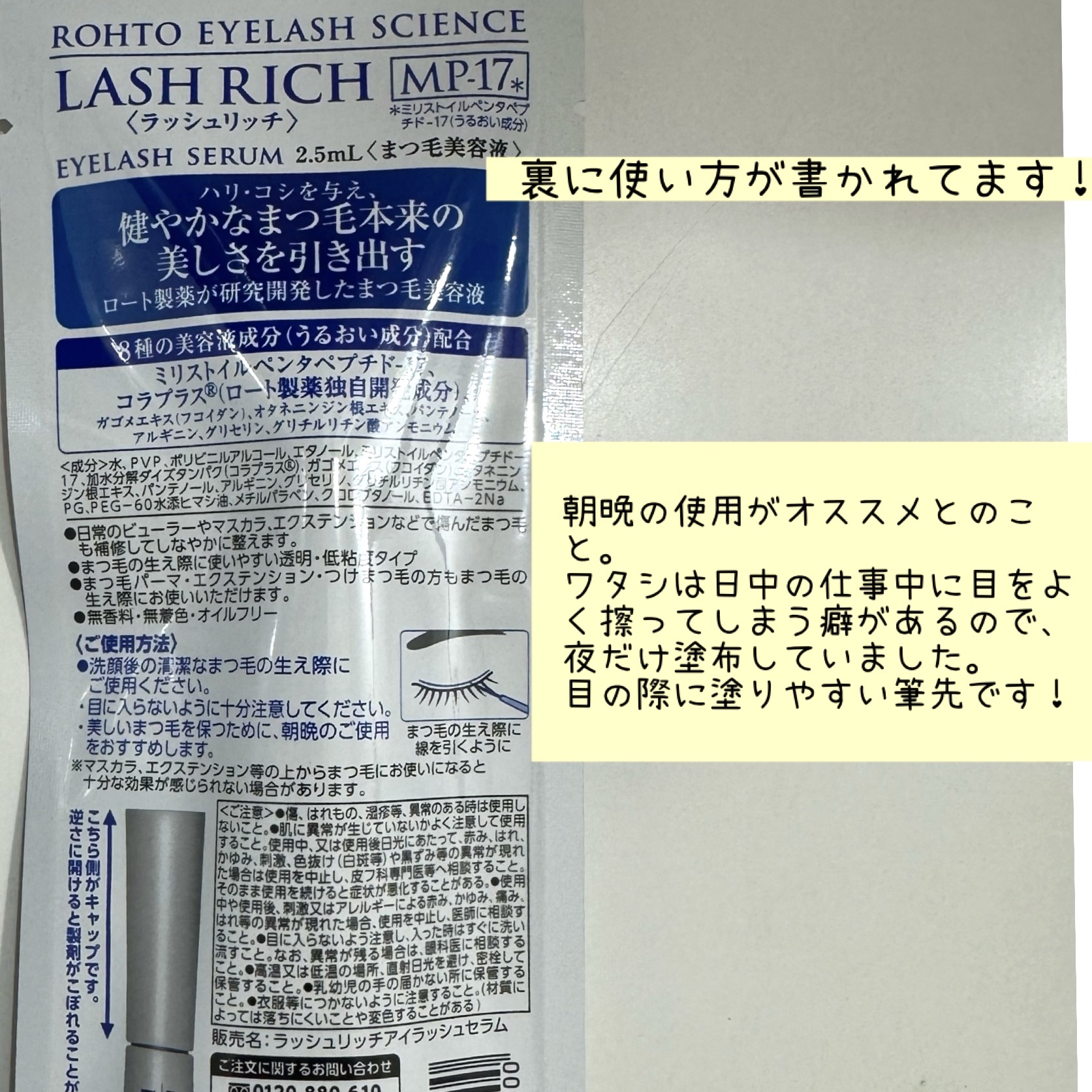 LASH RICH(ラッシュリッチ)は、MP-17、コラプラス®️を含む8種の美容液成分を配合したまつ毛美容液! 美容液は、まるで液体のような、かなりサラッとしたテクスチャーで、ベタつき感もありません◎ まつ毛の密度が濃くなってきたような気がします…! まつ毛の周期は、約3ヶ月と言われてるようなので、今後もコツコツと継続してケアしていきたいと思います☺️