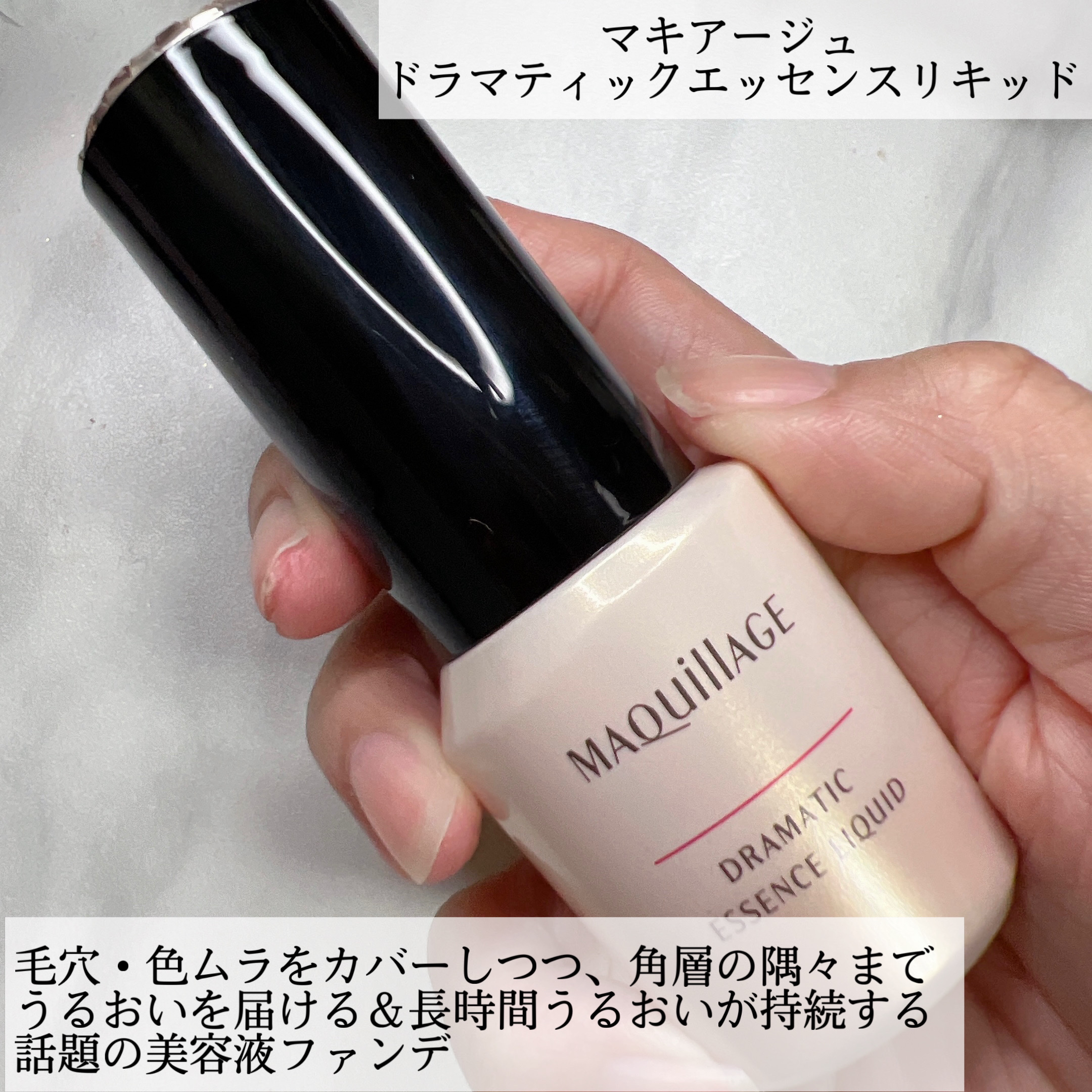 - カバーだけじゃない。極上つるん肌。毛穴レス美容液リキッドファンデ SPF50+・PA++++ ○乳化技術と美肌効果と浸透型美容液が三位一体となり、マキアージュ史上最高の美肌が叶うリキッドファンデーションです。 ① フルカバー×スキンケア乳化技術 └毛穴の凹凸にもピタッと密着。美容液を毛穴の奥まで届けながら、フルカバー ・保湿成分や油分のべたつきを感じさせず、なめらかな使用性を実現 ② ラスティング美肌効果 └毛穴・色ムラをフルカバーしながら、時間が経ってもくずれず、つけたての仕上がりが 長時間 持続 1 ・毛穴の凹凸を補正しながらつるんとした肌に見せる-毛穴レスつやパウダー ・カバーと透明感を同時に叶える-360 °美肌パウダー ・マスクをしていてもくずれにくい-ラスティングコート成分 ※1 13 時間化粧もち 毛穴の目立ちのなさ・つや・透明感・カバー力・化粧くずれのなさ データ取得済み 当社 調 べ。効果には個人差があります。 ③ 浸透型うるおい美容液 └長時間保湿持続。毛穴の奥までうるおいを届ける-グリシルグリシン ・グリセリン 整肌・保湿 ・たっぷりのうるおいで満たしつやのある肌に-ウォータリーキープエッセンス (ウォーターリリーエキス・スーパーヒアルロン酸(アセチルヒアルロン酸Na)・水溶性コラーゲン・グリセリン) 配合 ○1 回の使用量が分かりやすいディスペンサータイプです。 ○無香料、 ノンコメドジェニック・アレルギーテスト済 (全てのかたにニキビができない・アレルギーが起きないというわけではありません)