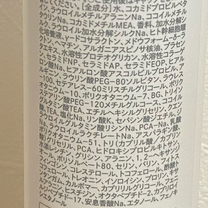 - <シャンプー(250ml)> 水、コカミドプロピルベタイン、ラウロイルメチルアラニンNa、ココイルメチルタウリンNa、コカミドメチルMEA、香料、加水分解シルク、ラウロイル加水分解シルクNa、ヒト幹細胞順化培養液、γ-ドコサラクトン、メドウフォーム-δ-ラクトン、ヘマチン、アルガニアスピノサ核油、プラセンタエキス、水溶性プロテオグリカン、水溶性コラーゲン、セラミドNP、セラミドAP、セラミドEOP、ヒアルロン酸Na、ヒアルロン酸アスコルビルプロピル、アルギニン、ラウリン酸PEG-80ソルビタン、ラウレス-100、セテアレス-60ミリスチルグリコール、ポリクオタニウム-10、ポリクオタニウム-7、BG、トリイソステアリン酸PEG-120メチルグルコース、ココイルグルタミン酸TEA、エチルヘキシルグリセリン、クエン酸、TEA、塩化Na、リン酸K、セバシン酸ジエチル、ジラウロイルグルタミン酸リシンNa、PCA-Na、乳酸Na、ラウロイルラクチレートNa、アスパラギン酸、ポリクオタニウム-51、トリ(カプリル酸/カプリン酸)グリセリル、PCA、ヒドロキシプロピルキトサン、水添レシチン、グリシン、アラニン、1,2 -ヘキサンジオール、ポリソルベート80、セリン、バリン、フィトスフィンゴシン、コレステロール、トコフェロール、酢酸トコフェロール、トレオニン、イソロイシン、プロリン、キサンタンガム、カルボマー、カプリリルグリコール、フェニルアラニン、ヒスチジン、オクタペプチド-2、カプリロイルジペプチド-17、安息香酸Na、エタノール、フェノキシエタノール <トリートメント(250ml)> 水、ソルビトール、ステアリルアルコール、ジメチコン、グリセリン、セタノール、PPG-3カプリリルエーテル、香料、セバシン酸ジエチルヘキシル、ステアリン酸グリセリル、ステアルトリモニウムクロリド、トリ(カプリル酸/カプリン酸)グリセリル、加水分解シルク、(加水分解シルク/PGプロピルメチルシランジオール)クロスポリマー、γ-ドコサラクトン、メドウフォーム-δ-ラクトン、ヒト幹細胞順化培養液、プラセンタエキス、ヒアルロン酸Na、ヒアルロン酸アスコルビルプロピル、水溶性コラーゲン、セラミドAP、セラミドNP、セラミドEOP、ホホバ種子油、マカデミア種子油、ローズヒップ油、スクワラン、アルガニアスピノサ核油、オリーブ果実油、アルギニン、ステアラミドプロピルジメチルアミン、ジメチコノール、イソプロパノール、フェノキシエタノール、イソステアリルアルコール、アモジメチコン、トリポリヒドロキシステアリン酸ジペンタエリスリチル、BG、乳酸、ポリクオタニウム-10、ヒドロキシエチルセルロース、乳酸Na、エチドロン酸、ヘマチン、シクロヘキサン-1,4-ジカルボン酸ビスエトキシジグリコール、セバシン酸ジエチル、ヒドロキシエチルウレア、PCA-Na、ラウロイルラクチレートNa、アスパラギン酸、PCA、水添レシチン、グリシン、アラニン、1,2-ヘキサンジオール、ポリソルベート80、セリン、バリン、フィトスフィンゴシン、コレステロール、酢酸トコフェロール、トコフェロール、トレオニン、イソロイシン、プロリン、キサンタンガム、カルボマー、カプリリルグリコール、ヒスチジン、フェニルアラニン、オクタペプチド-2、カプリロイルジペプチド-17、エタノール