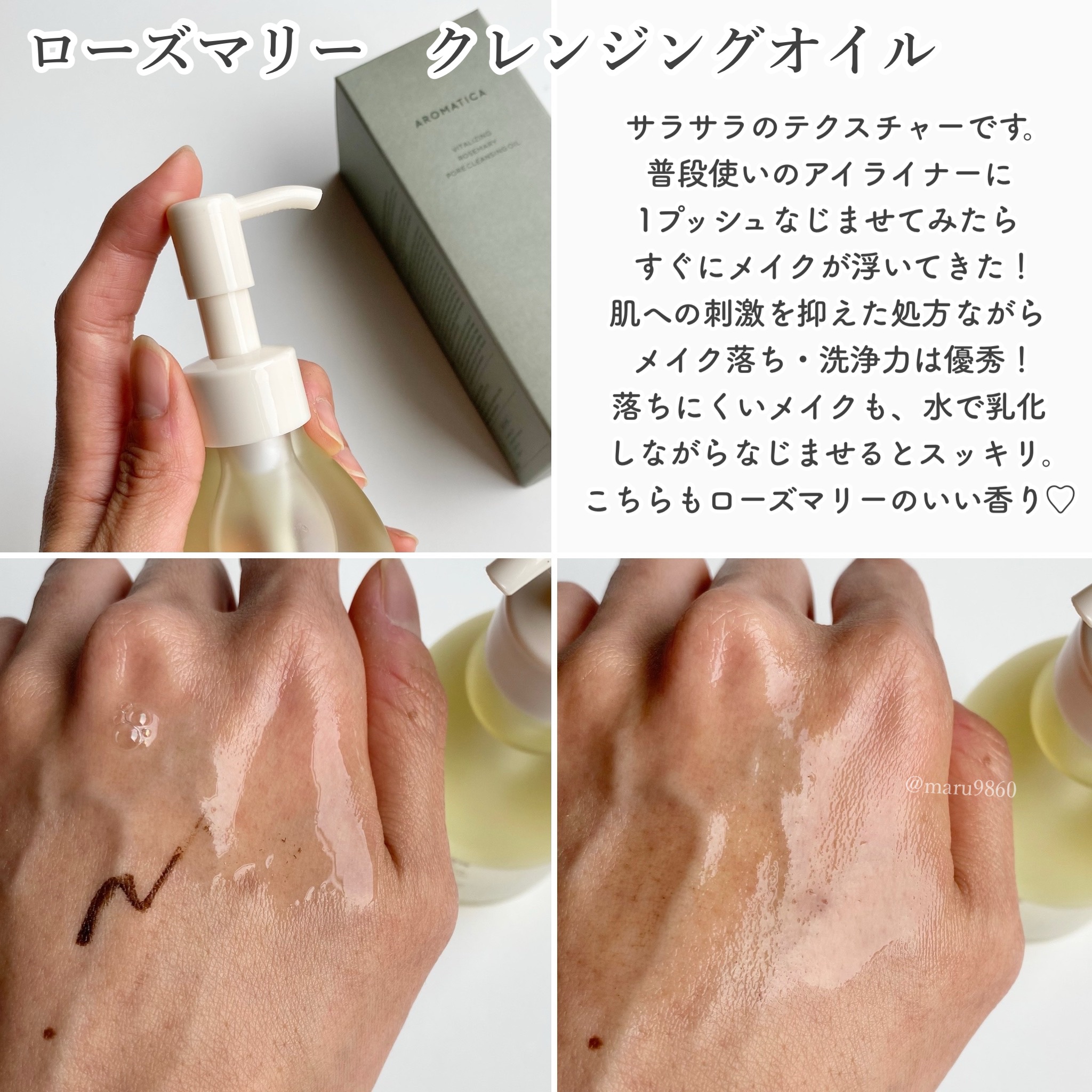 ローズマリーの香りが心地よくて癒される🍃 5つの植物由来オイル配合🌿サラッとしたオイルで擦らずにメイクが浮き上がるよ✨️さっぱりとした使用感でやさしい洗い心地なのにメイクはしっかりoff◎ ローズマリーの葉とグリーンクレイを配合🌿 皮脂をしっかり落としながら角質ケアも✨️さっぱりするけど肌はしっとり整う感じが良かった。 アロマティカさんのアイテムは香りが良くてとにかく癒されます☺️ ぜひメガ割でチェックしてみてね💕︎
