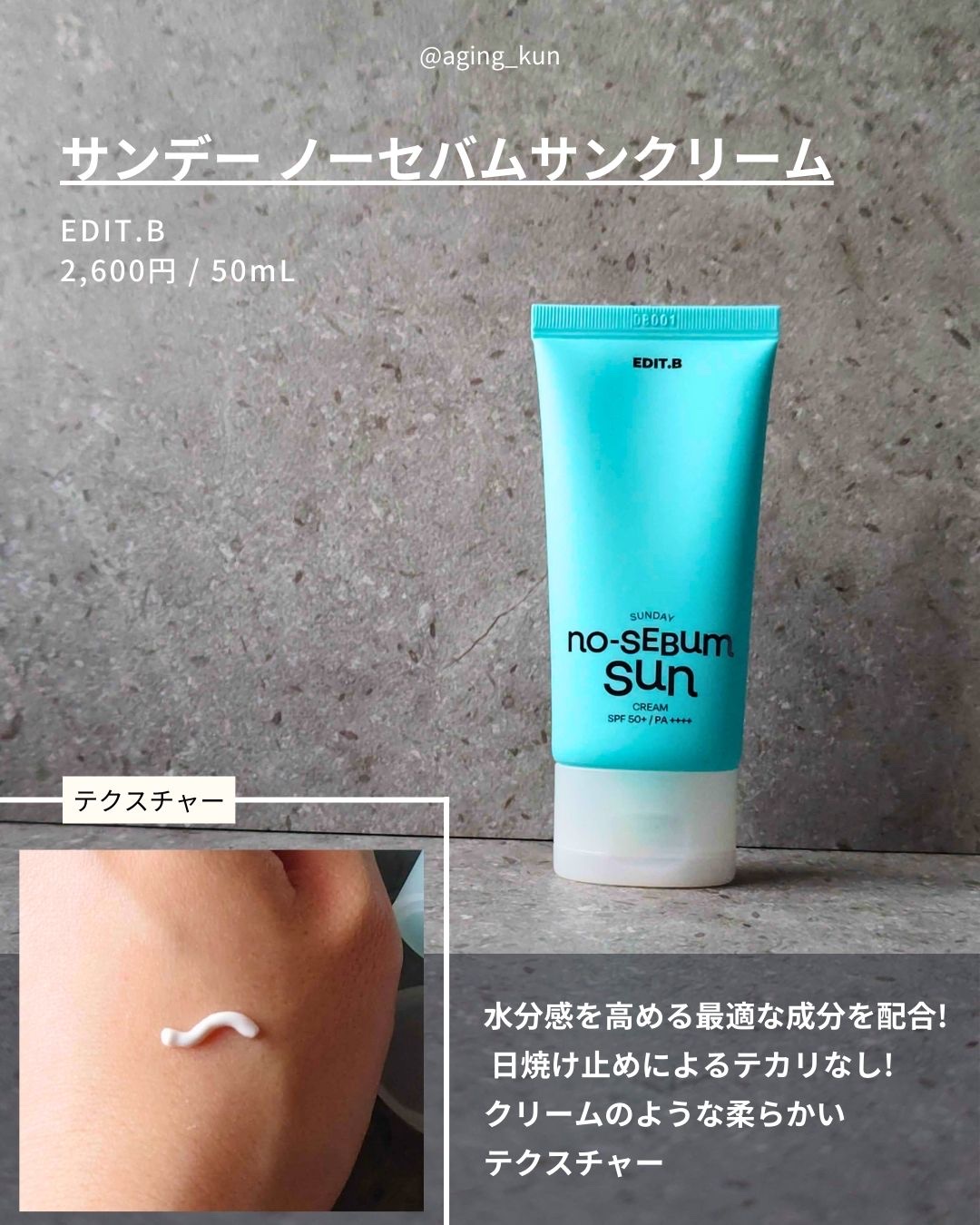 敏感肌にもオススメ紫外線を完璧にカット!EDIT.Bサンデーノーセバムサンクリーム(@edit.b_japan)□特徴毛穴&皮脂抑制効果ナチュラルなトーンアップ効果低刺激性日焼け止めしっとり感のあるサンケアコスメ強力なUVカット効果海...
