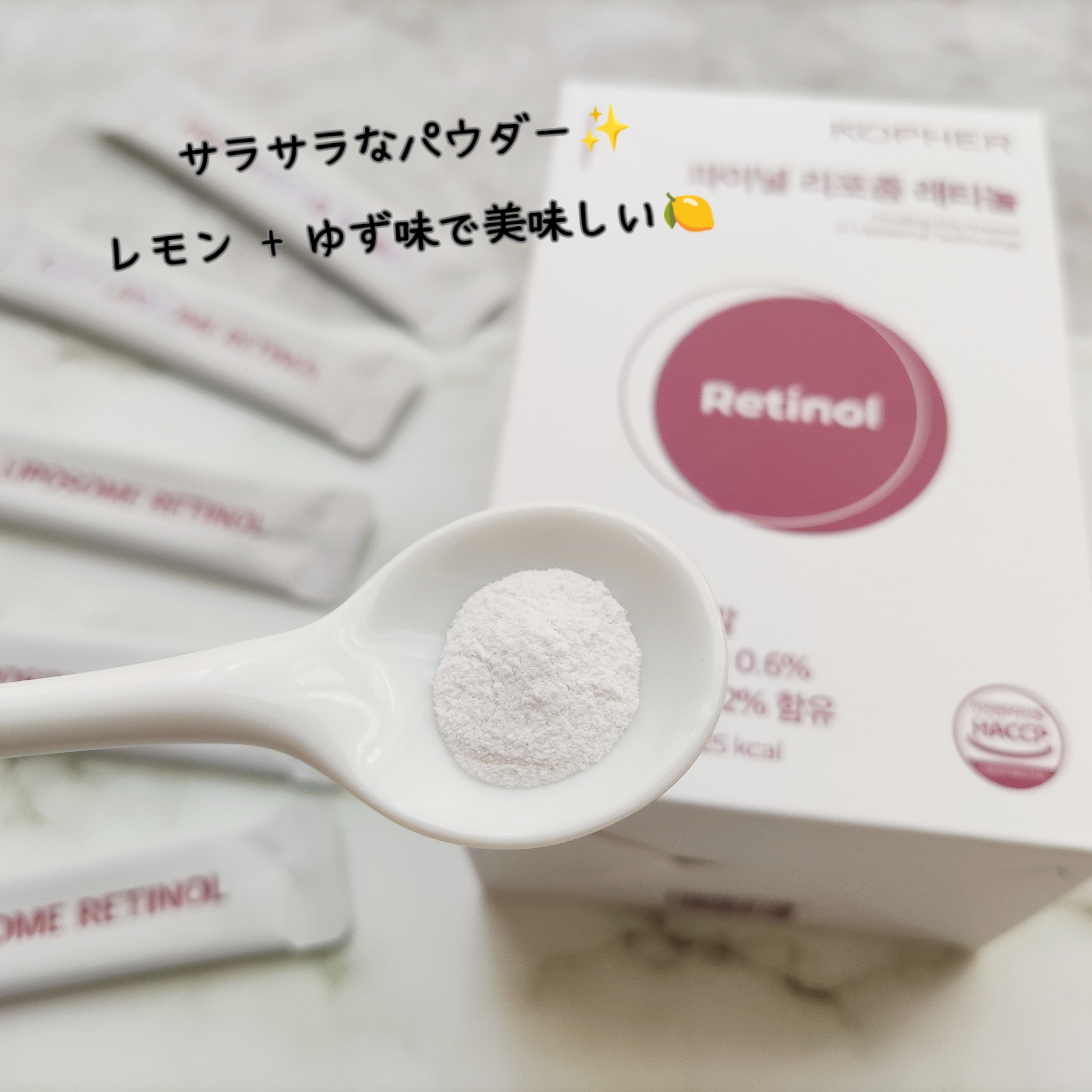 ビタミンA(レチノール)とリポソームビタミンCが配合されたサプリ❤️ リポソーム化されたビタミンCは体への吸収率がよく、効率的に栄養補給できちゃいます✨ レモン味なのですが砂糖がゼロなのにほんのり甘いので飲みやすい🍋 水無しで飲める&個包装なので出先でも飲める🙆♀️ レチノールは肌質を選ぶけど、飲むタイプは誰でも飲めるので全身プルプルになりたい方におすすめです😍