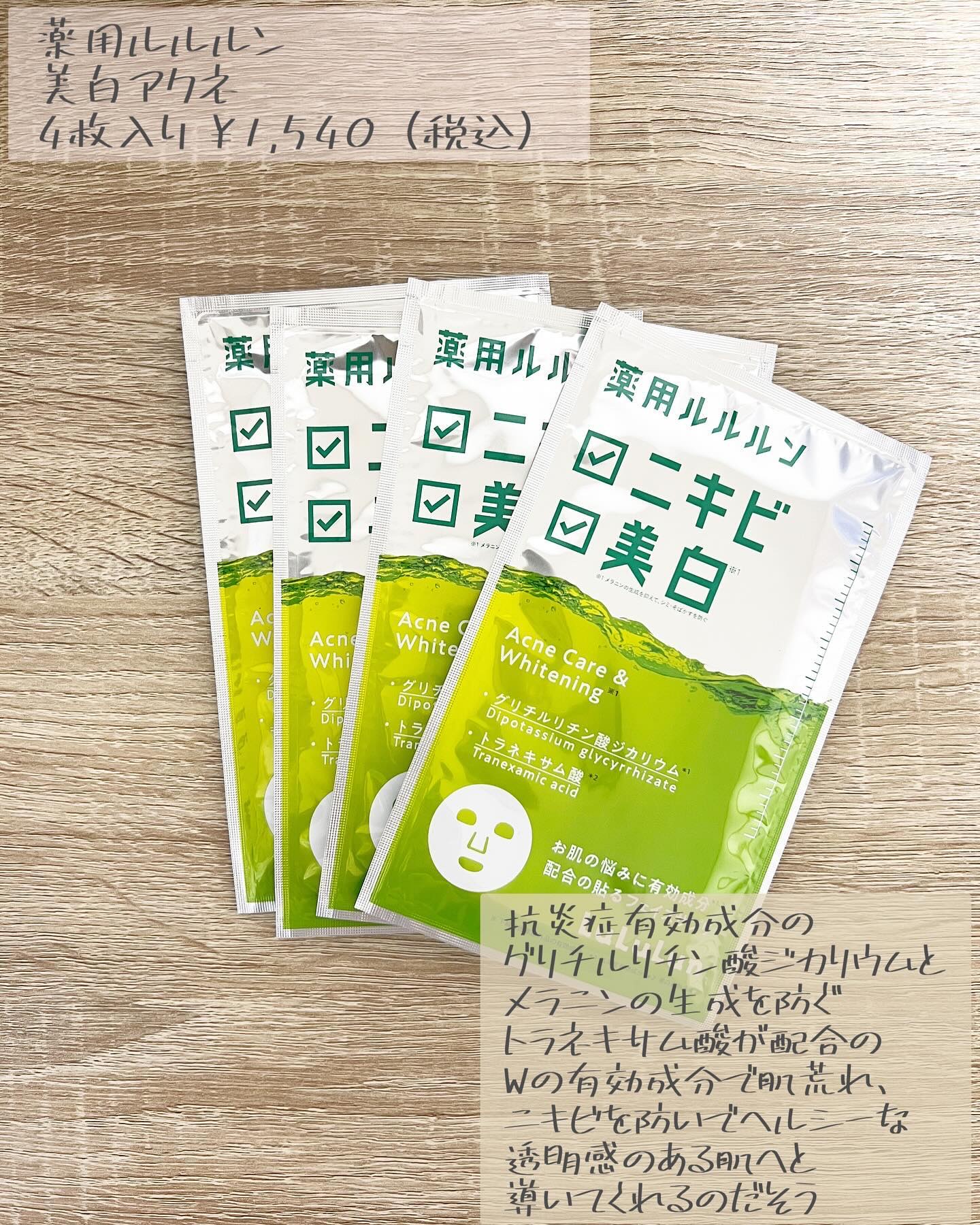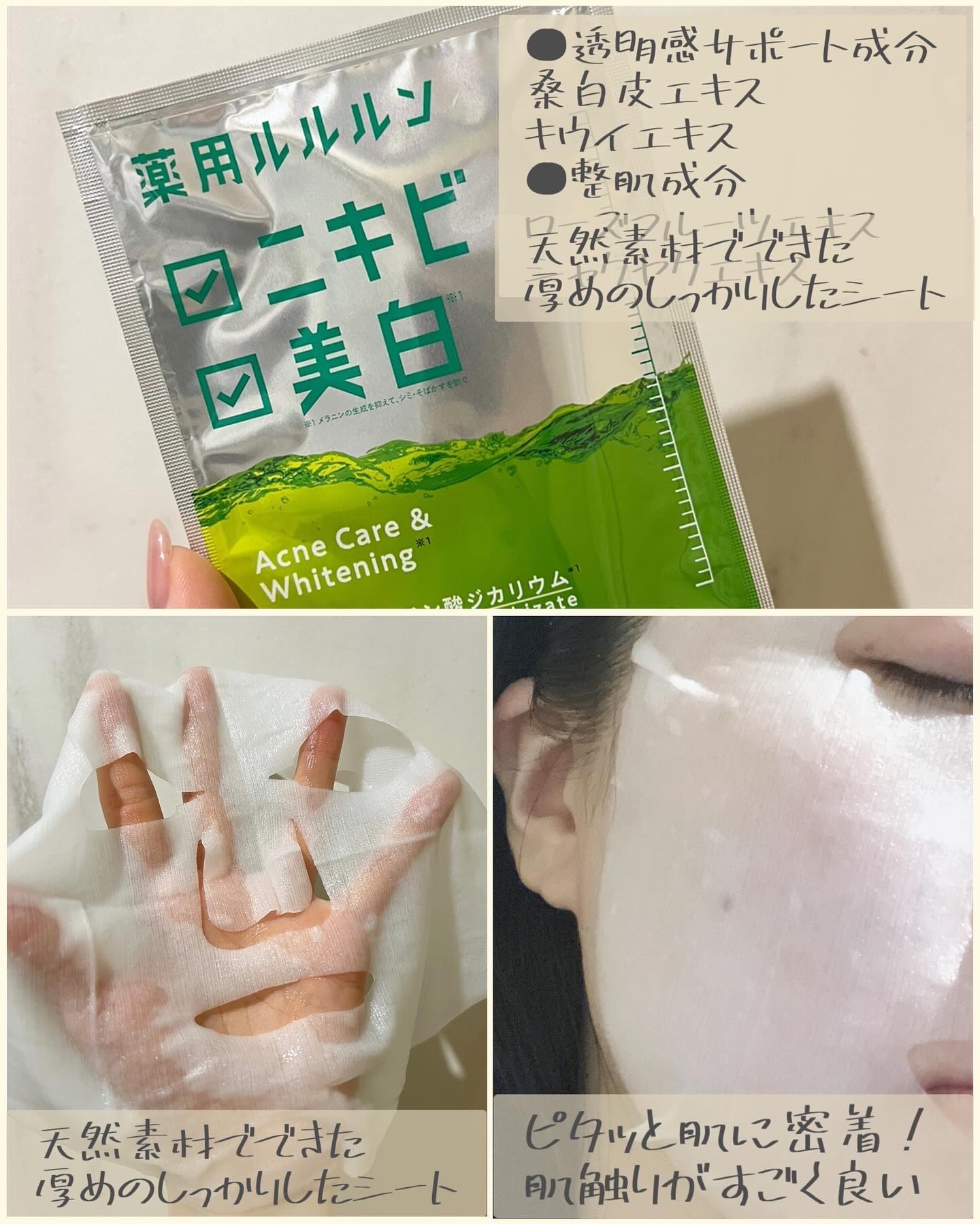 - 【医薬部外品】 ルルルン初の医薬部外品、「薬用ルルルン」が登場。 「薬用ルルルン 美白アクネ」はニキビを予防したい方、美白※1・くすみ※2をケアしたい方におすすめ。 (※1 メラニンの生成を抑えて、シミ・そばかすを防ぐ ※2乾燥による)