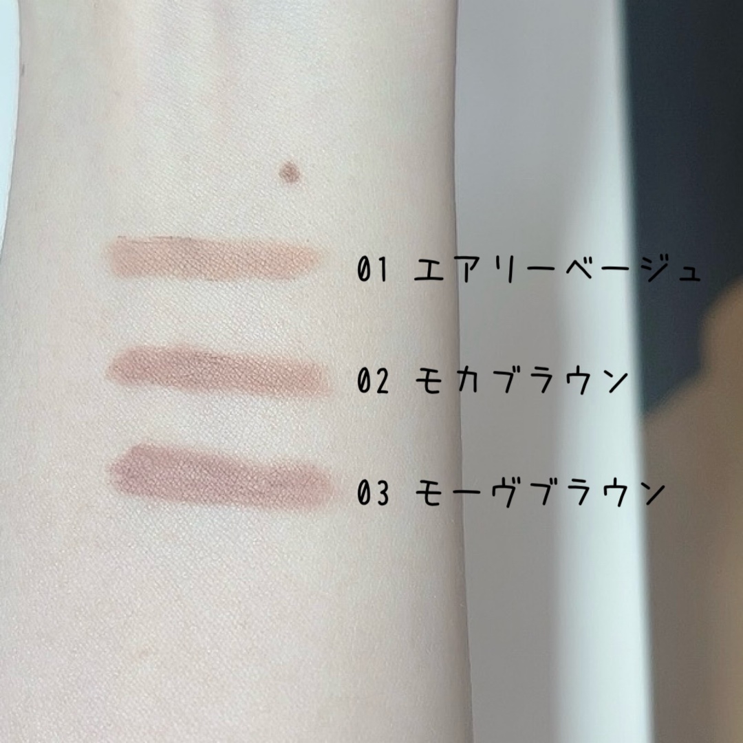 - <01 ライトベージュ> イソドデカン、酸化チタン、イソヘキサデカン、トリメチルシロキシケイ酸、酸化鉄、水添マイクロクリスタリンワックス、(C20-40)アルコール、ポリエチレン、パラフィン、合成ワックス、水添ポリシクロペンタジエン、アルガニアスピノサ核油、ヒマシ油、メドウフォーム油、オリーブ果実油、アーモンド油、ホホバ種子油、プルケネチアボルビリス種子油、ツルドクダミエキス、トコフェロール、シリカ、トリエトキシカプリリルシラン、モンタン酸グリコール、水酸化Al、ステアロキシジメチコン、水、メチコン、BG、フェノキシエタノール <02 モカブラウン> イソドデカン、酸化チタン、イソヘキサデカン、トリメチルシロキシケイ酸、酸化鉄、水添マイクロクリスタリンワックス、(C20-40)アルコール、ポリエチレン、パラフィン、合成ワックス、水添ポリシクロペンタジエン、アルガニアスピノサ核油、ヒマシ油、メドウフォーム油、オリーブ果実油、アーモンド油、ホホバ種子油、プルケネチアボルビリス種子油、ツルドクダミエキス、トコフェロール、シリカ、トリエトキシカプリリルシラン、モンタン酸グリコール、水酸化Al、ステアロキシジメチコン、水、メチコン、BG、フェノキシエタノール <03 モーヴピンク> イソドデカン、酸化チタン、イソヘキサデカン、トリメチルシロキシケイ酸、酸化鉄、水添マイクロクリスタリンワックス、(C20-40)アルコール、ポリエチレン、パラフィン、合成ワックス、水添ポリシクロペンタジエン、アルガニアスピノサ核油、ヒマシ油、メドウフォーム油、オリーブ果実油、アーモンド油、ホホバ種子油、プルケネチアボルビリス種子油、ツルドクダミエキス、トコフェロール、シリカ、トリエトキシカプリリルシラン、モンタン酸グリコール、水酸化Al、ステアロキシジメチコン、水、メチコン、BG、フェノキシエタノール