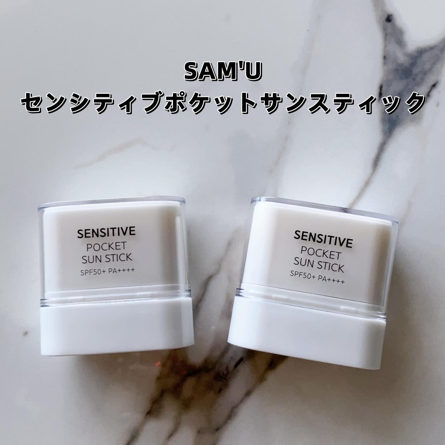 SAM'U/サミュセンシティブポケットサンスティック SPF50+PA++++小さいのに強力なUVブロック🌞べたつきなくフェイスやボディへいつでもどこでも簡単ひと塗り!箱を真ん中からパキッと半分に割ることができて、中にはポケットサイズのスティ...