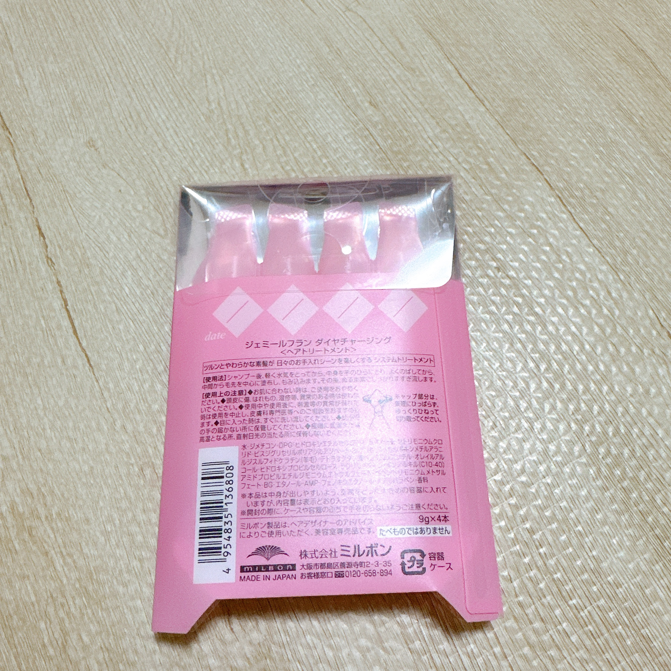 - <9g × 4> 水、ジメチコン、DPG、ヒドロキシエチルセルロース、セタノール、セトリモニウムクロリド、ビスジグリセリルポリアシルアジペート-2、グリセリン、カルボキシメチルアラニルジスルフィドケラチン(羊毛)、テトラオクタン酸ペンタエリスリチル、オレイルアルコール、ヒドロキシプロピルセルロース、ラウリルベタイン、イソアルキル(C10-40)アミドプロピルエチルジモニウムエトサルフェート、ベヘントリモニウムメトサルフェート、BG、エタノール、AMP、フェノキシエタノール、メチルパラベン、香料