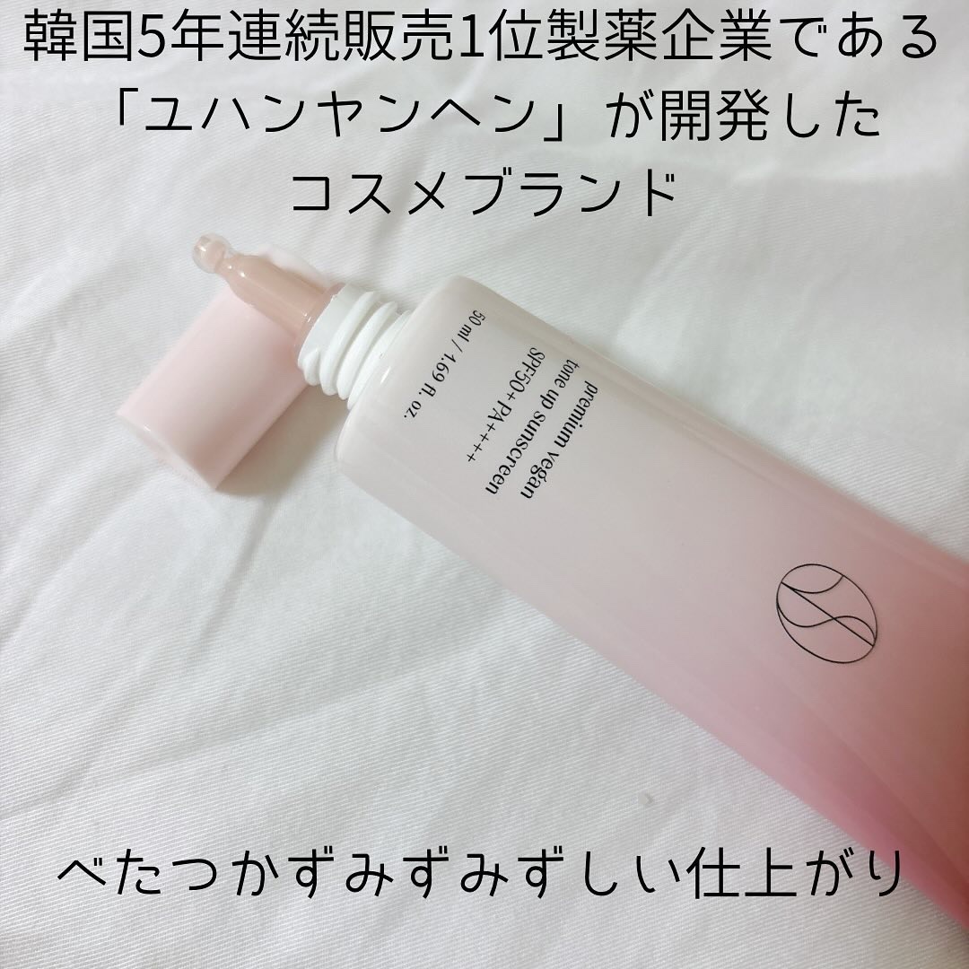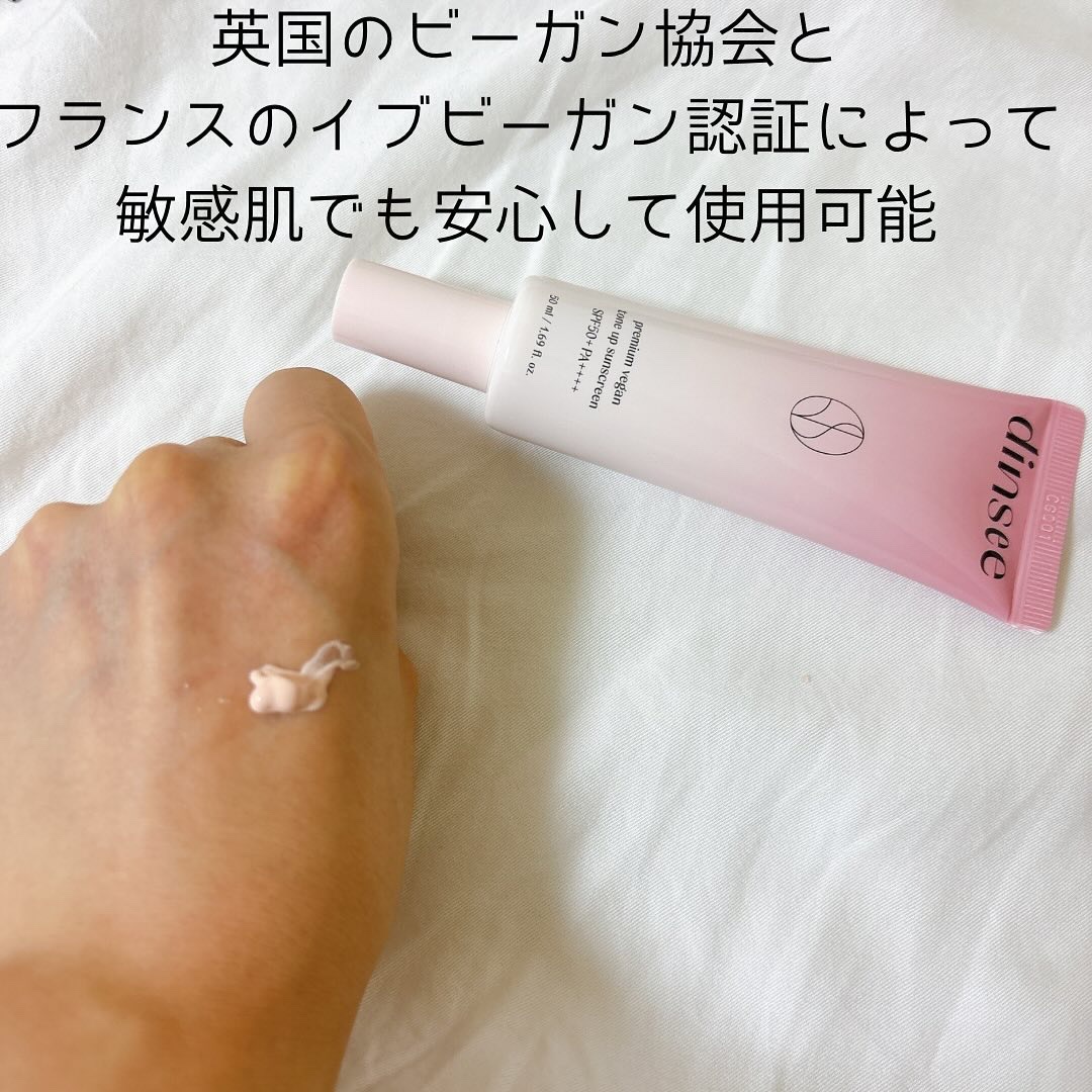 とっても使い勝手のいい化粧下地🫶🏻💕︎︎ dinseeの プレミアムビーガントーンアップ日焼け止め 韓国で初めてフランスの「EVE VEGAN」や英国のヴィーガン協会より認められたんだって⸜🙌🏻⸝ 薄ピンクのクリームでスキンケア感覚で使える軽いテクスチャー✨️ 自然にトーンアップしてくれて日焼け止め&下地効果あるの嬉しい♥️