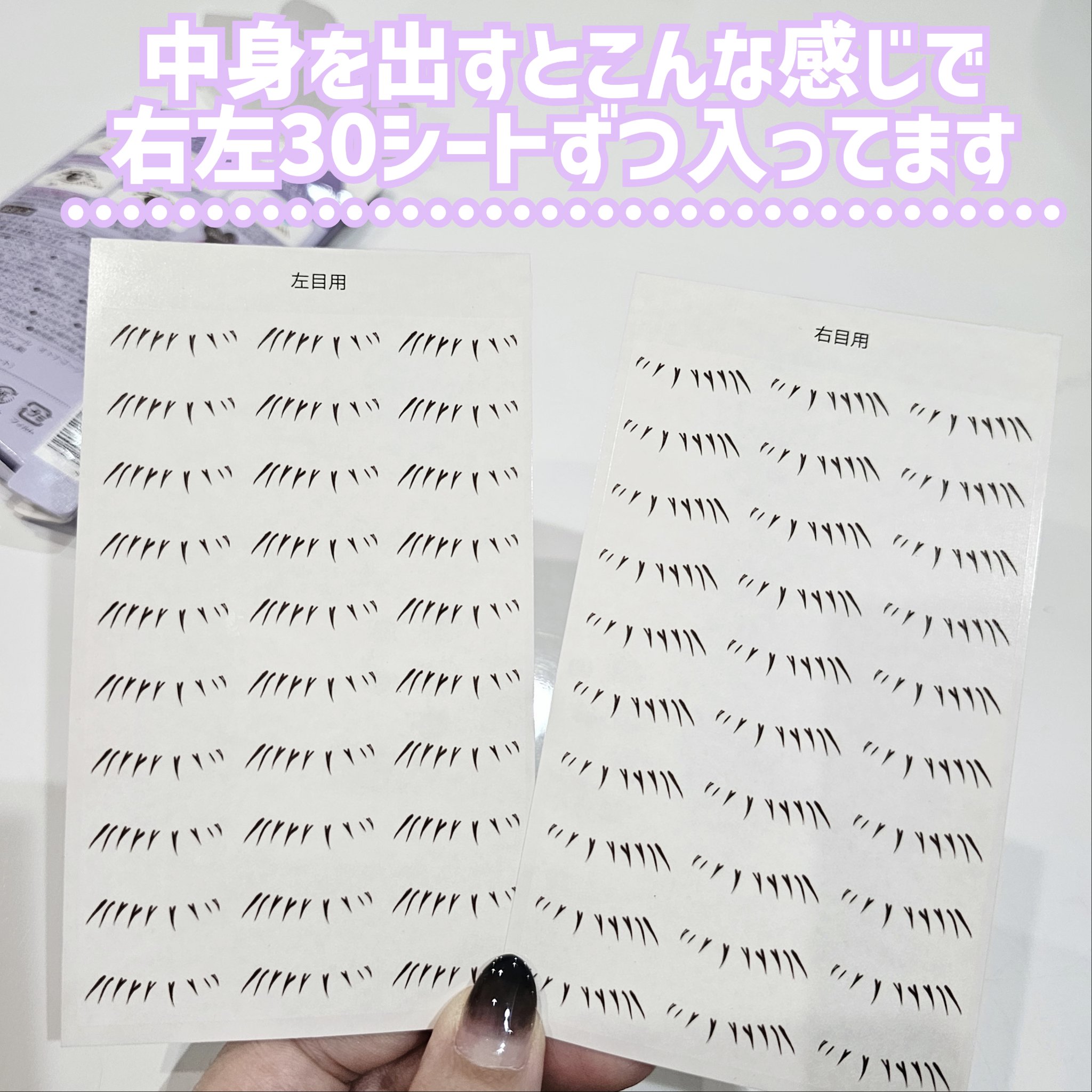 モテナチュラルは束感が細いので自然な仕上がり。 オトナゴージャスは1本1本しっかり束感があるため華やかな仕上がり。 使用方法は簡単! カットして水に濡らして貼るだけ。 アイラインで下まつ毛描くよりもヨレにくくて持ちがいいよ。 少しテカリが気になるけど上からアイシャドウ載せたらカバーできる◎