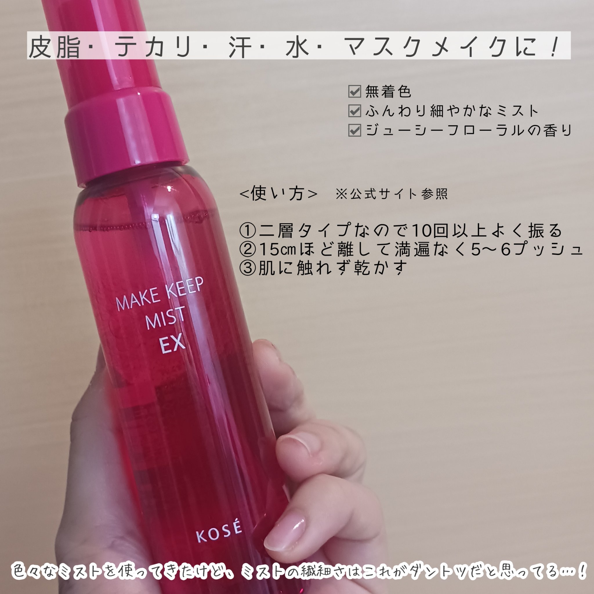 | フィックスミストランキング第1位 | ベースの崩れが皮脂より乾燥からくる人に特にオススメ✨ サラッとというより、しっとりツヤ肌感 | 詳細を見る | |