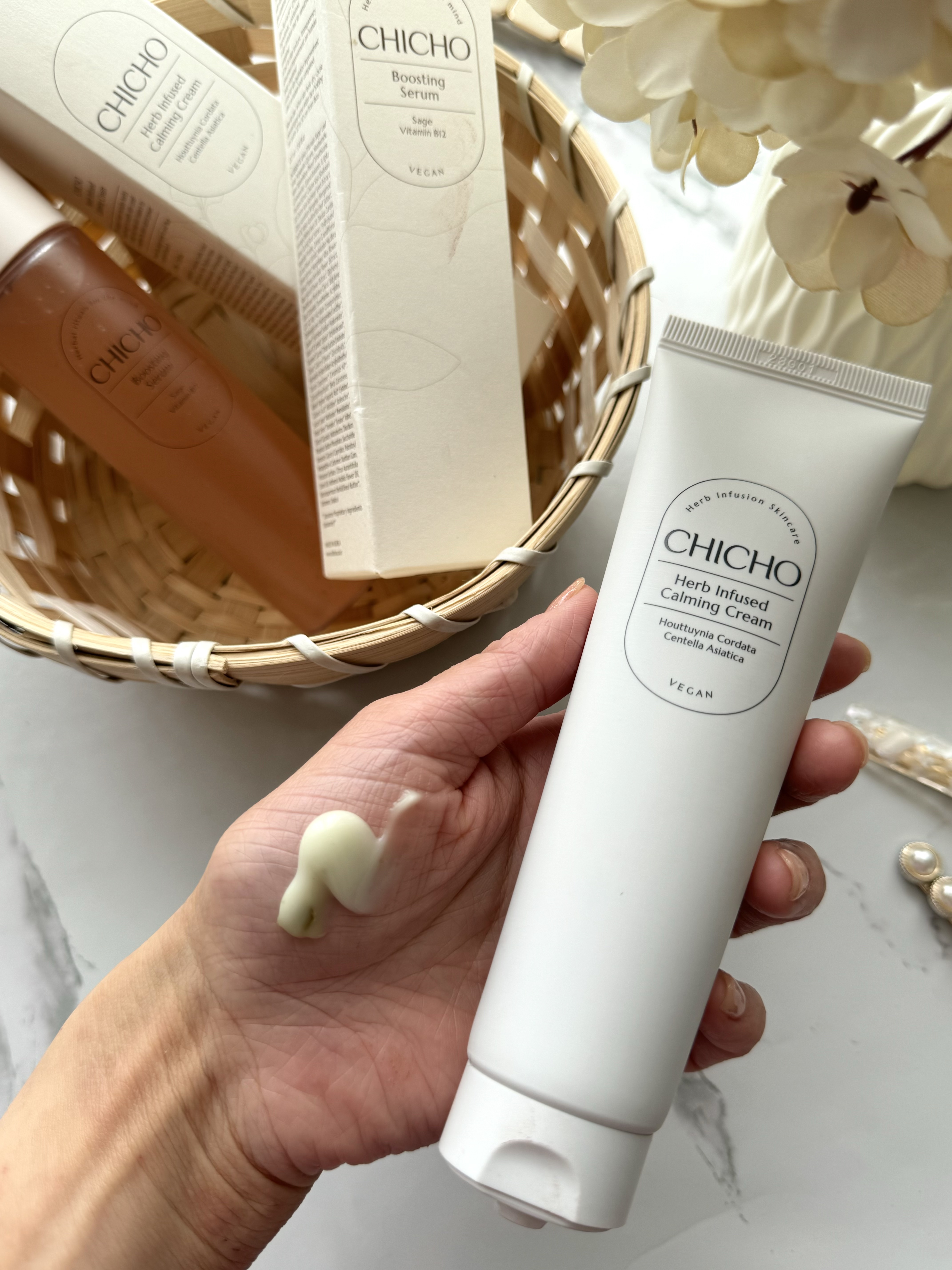 世界各地から取集したハーブを使った韓国のヴィーガンブランド CHICHO(シチョ)🕊️ 成分の70%を占めるドクダミとツボ草。赤み肌や敏感な肌の深い保湿ケアに◎ セージ葉水88%と高配合のブースティングミストセラム。肌の内側から水分を満たし自然なつや感がいい♪