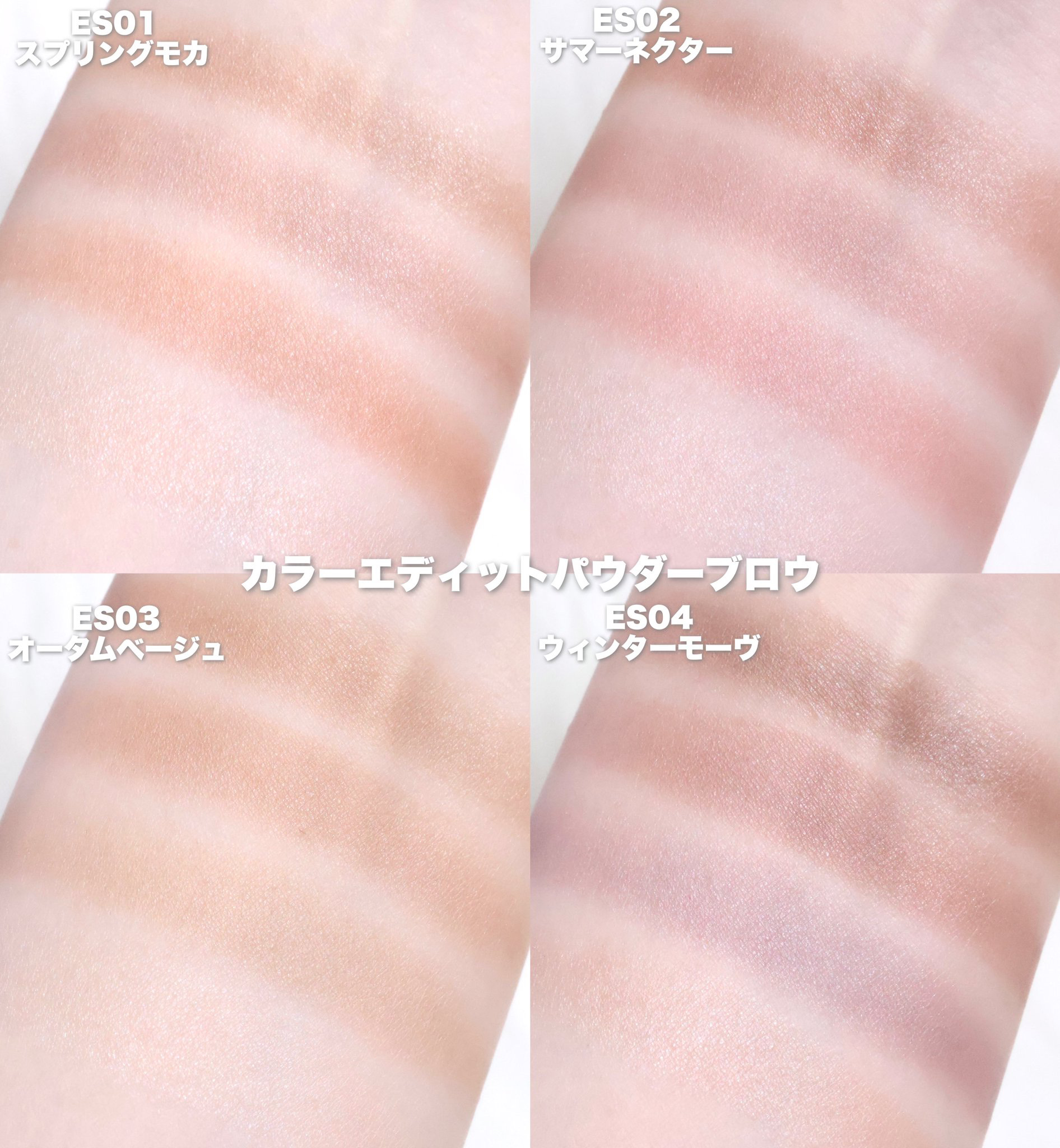 - <EP01 スプリングモカ><EP02 サマーネクター> <EP03 オータムベージュ><EP04 ウィンターモーヴ> タルク、ジメチコン、合成フルオロフロゴパイト、シリカ、リンゴ酸ジイソステアリル、合成モクロウ、パンテノール、スクワラン、トコフェロール、フェノキシエタノール、グンジョウ、ステアリン酸Mg、マイカ、酸化チタン、酸化鉄、水酸化Al