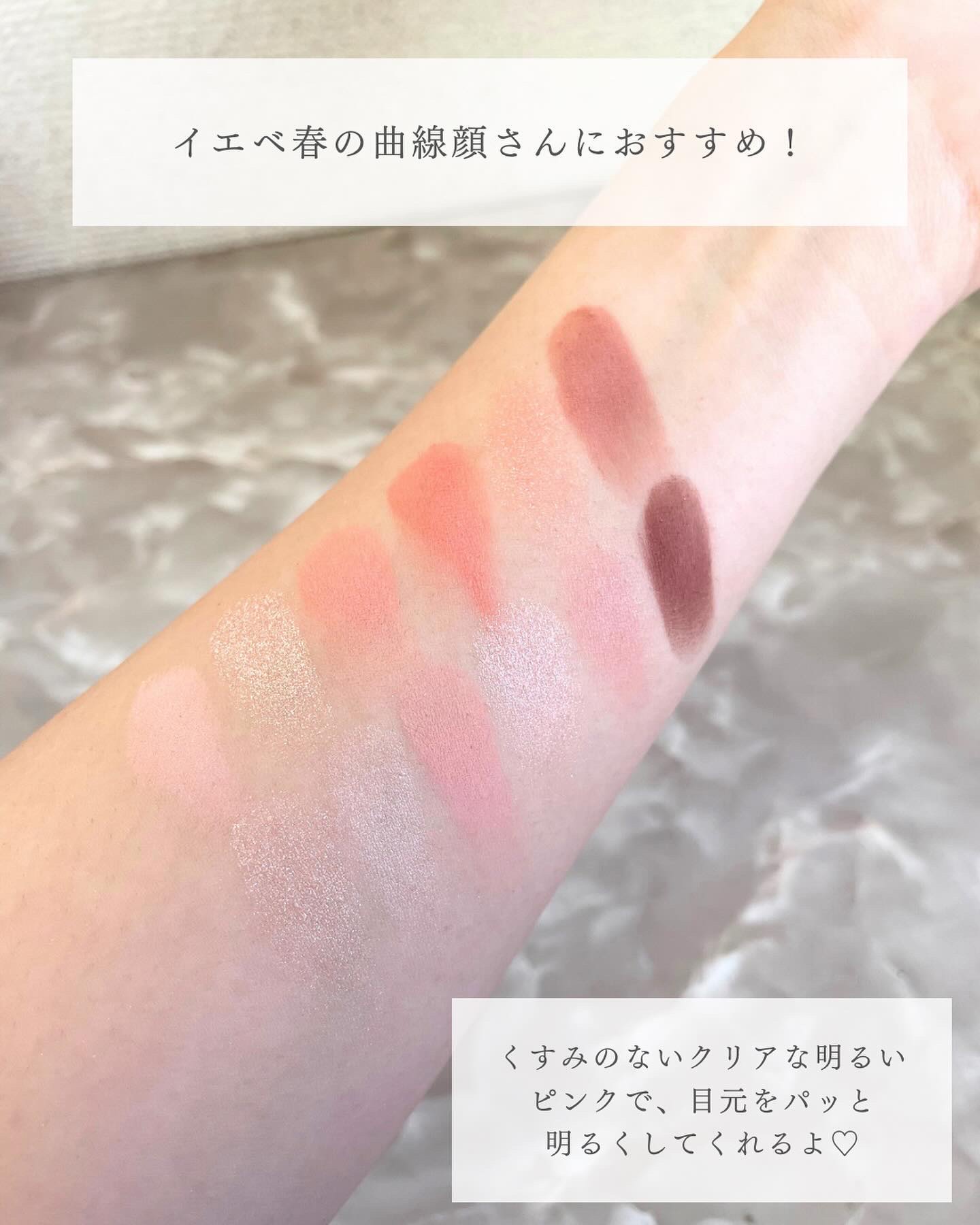 - 軽やかテクスチャーが目元に密着し、抜け感のある色使いが楽しめるデイリーパレット <101 ローズダイアリー(ROSE DIARY)> オーナメントを飾り付けたローズツリーのようにほのかに輝くウォームローズピンクカラー(イエベ秋)。 <102 ミュートアーカイブ(MUTE ARCHIVE)> 少女たちのピンキーなホームパーティームードを盛り込んだクールでヌーディーなミューテッドモブカラー(ブルべ夏ミュート)。 <103 バニラヘイズ(VANILLA HAZE)> 焼きたてのジンジャークッキーのように暖かく香ばしいウォームミュートカラー(イエベ秋ミュート)。 <104 GHR ピンク(GYEONGHOERU FLOWER FESTIVAL)> 春の日の美しく優雅な色を詰め込んだピンクカラーパレット。イエベ春&ブルベ夏におすすめのパレットです。 <105 DSG バイオレット(DEOKSUGUNG STONE WALL ROAD)> ほんのりピンクがかった柔らかなモーブカラーパレット。ブルベ夏&ブルベ冬におすすめのパレットです。 <106 DBG コーラル(GYEONGBOKGUNG STROLL)> 明るい日差しの色を取り入れたデイリーなコーラルカラー。イエベ春&ブライト秋におすすめのパレットです。