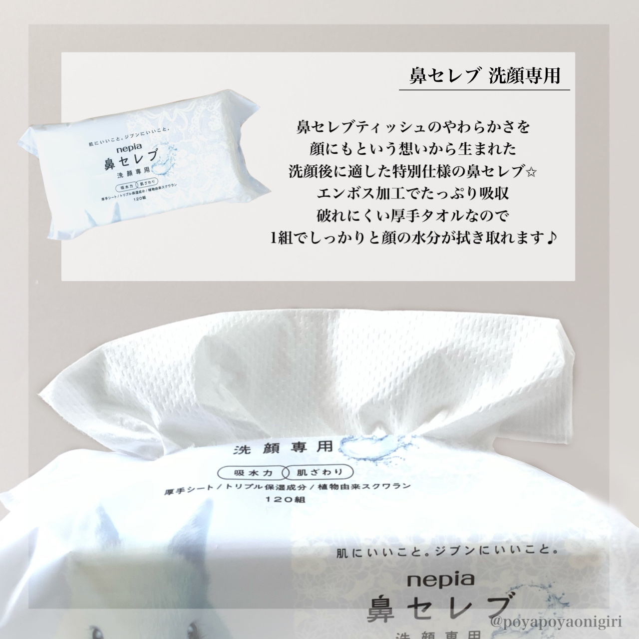 王子ネピア様からいただきました♡◆nepia鼻セレブ洗顔専用鼻セレブと言えばティッシュのイメージが強くて有名だけど、こちらは洗顔専用の鼻セレブ✨鼻セレブボックスティシュと比べて吸水速度は3倍以上、ぬれた時のシートの強度は2倍以上で、鼻セレブボ...