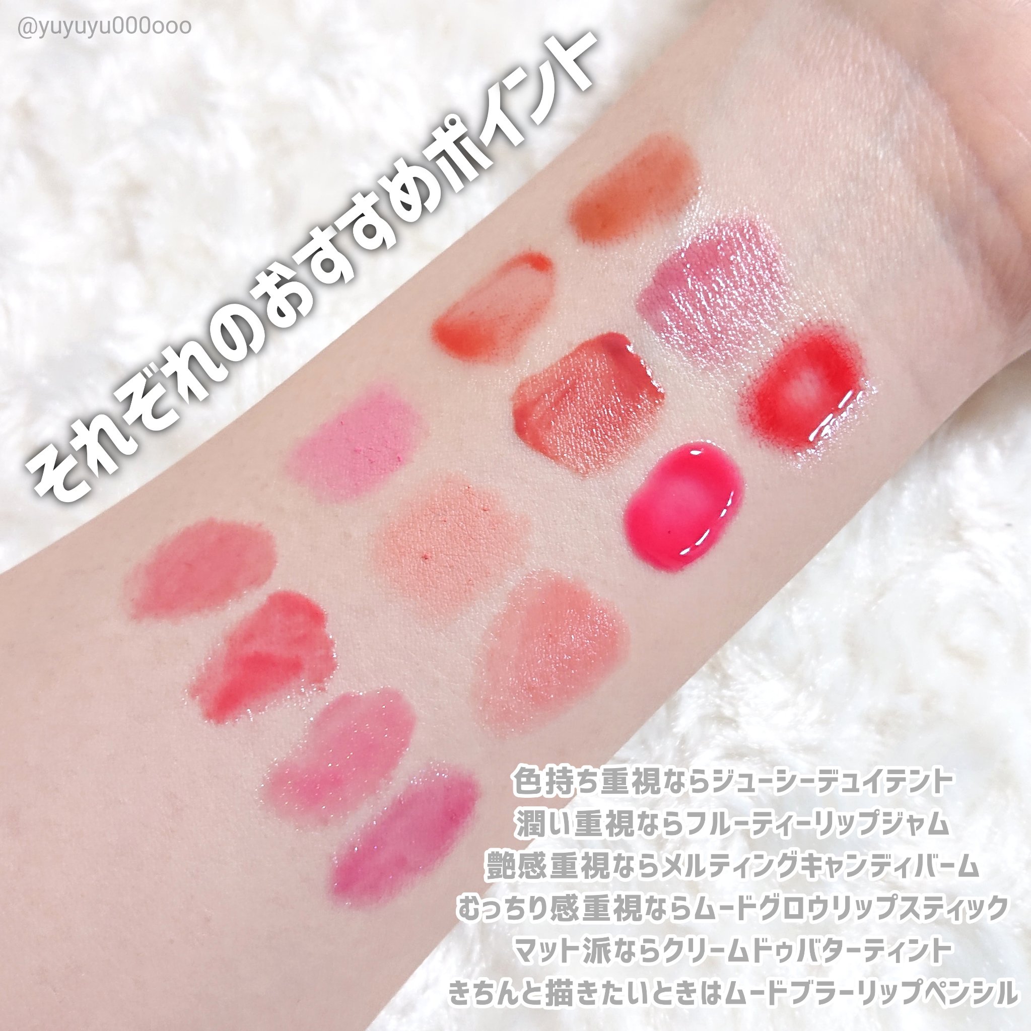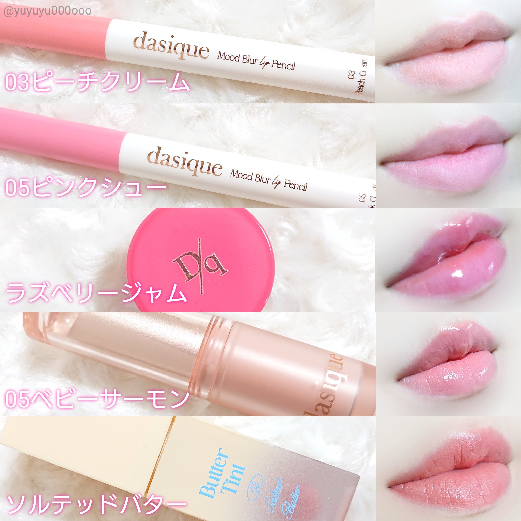 ピーチクリームは肌なじみの良いコーラル系のピンクで、ミスティライラックは青み寄りのピンクです!! ウォーターブラーティントはマットタイプで発色色持ちともにすごく良い👌 苺のパケが乙女可愛いなーっていつも店で見てました🥹