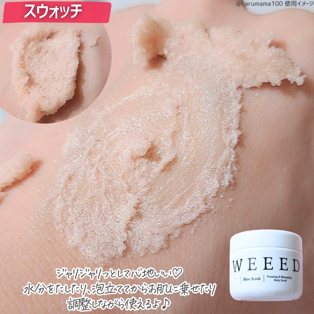 - 【医薬部外品】魅せるための薬用ボディスクラブ「WEEED Bliss Scrub」(ウィード ブリススクラブ)です。ニキビ予防、体臭予防、清浄・殺菌、保湿・潤いをケアします。シーソルトスクラブで、角質層を優しい使い心地でオフします。しっかり泡立ててボディソープとしてご利用も可能です。