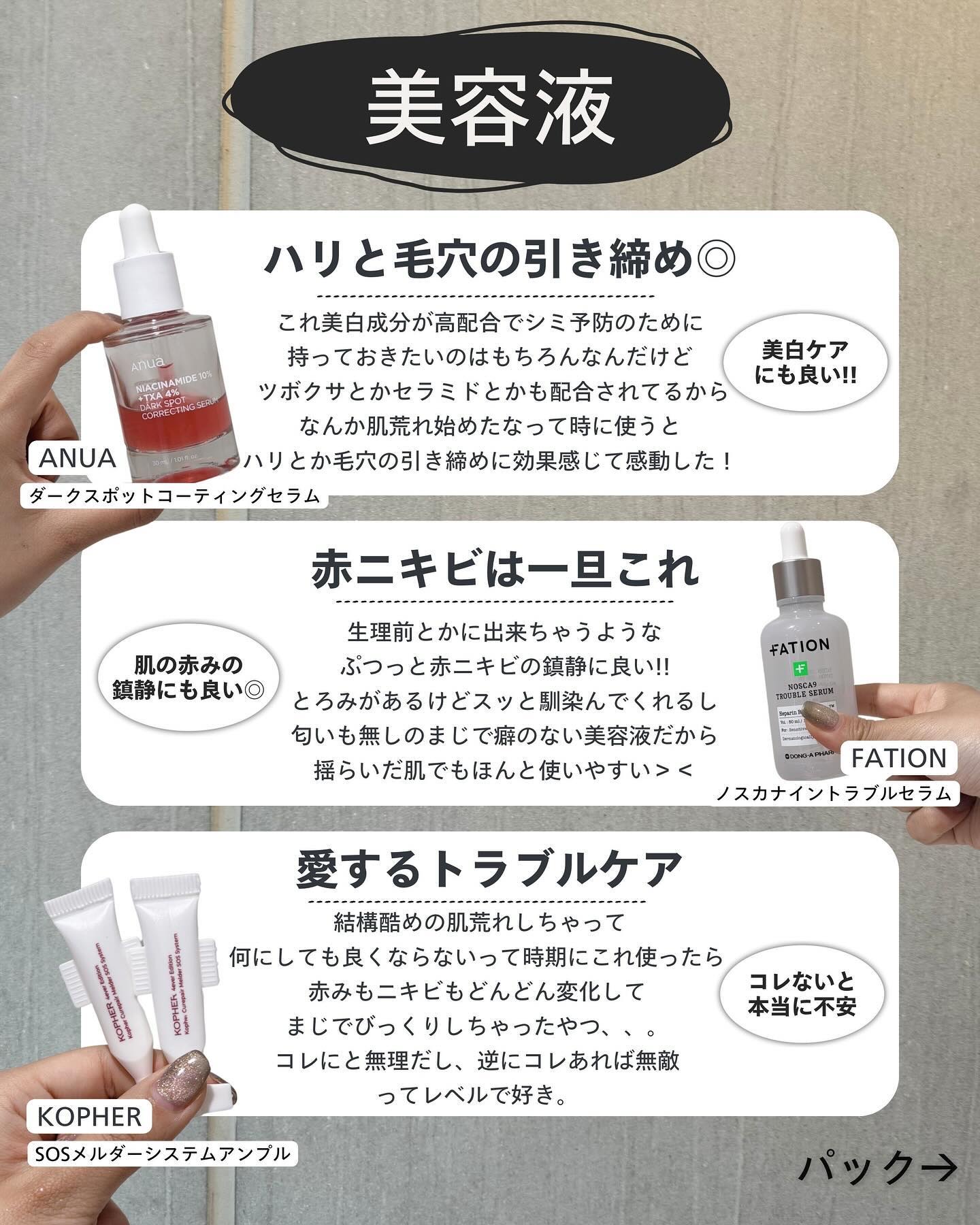 Anuaの美容液の組み合わせを紹介!みんなメガ割でAnuaの美容液買った人多いんじゃない? ニキビに悩む人におすすめしたい組み合わせは、アゼライン酸とシラカバ!この組み合わせ使うようになってニキビ出来にくくなった気がする🥺 ナラが最近ハマってる一推し組み合わせは、PDRNとレチノール✨ 毛穴ケアに最適で、使った後の肌のもっちり感がたまらん!