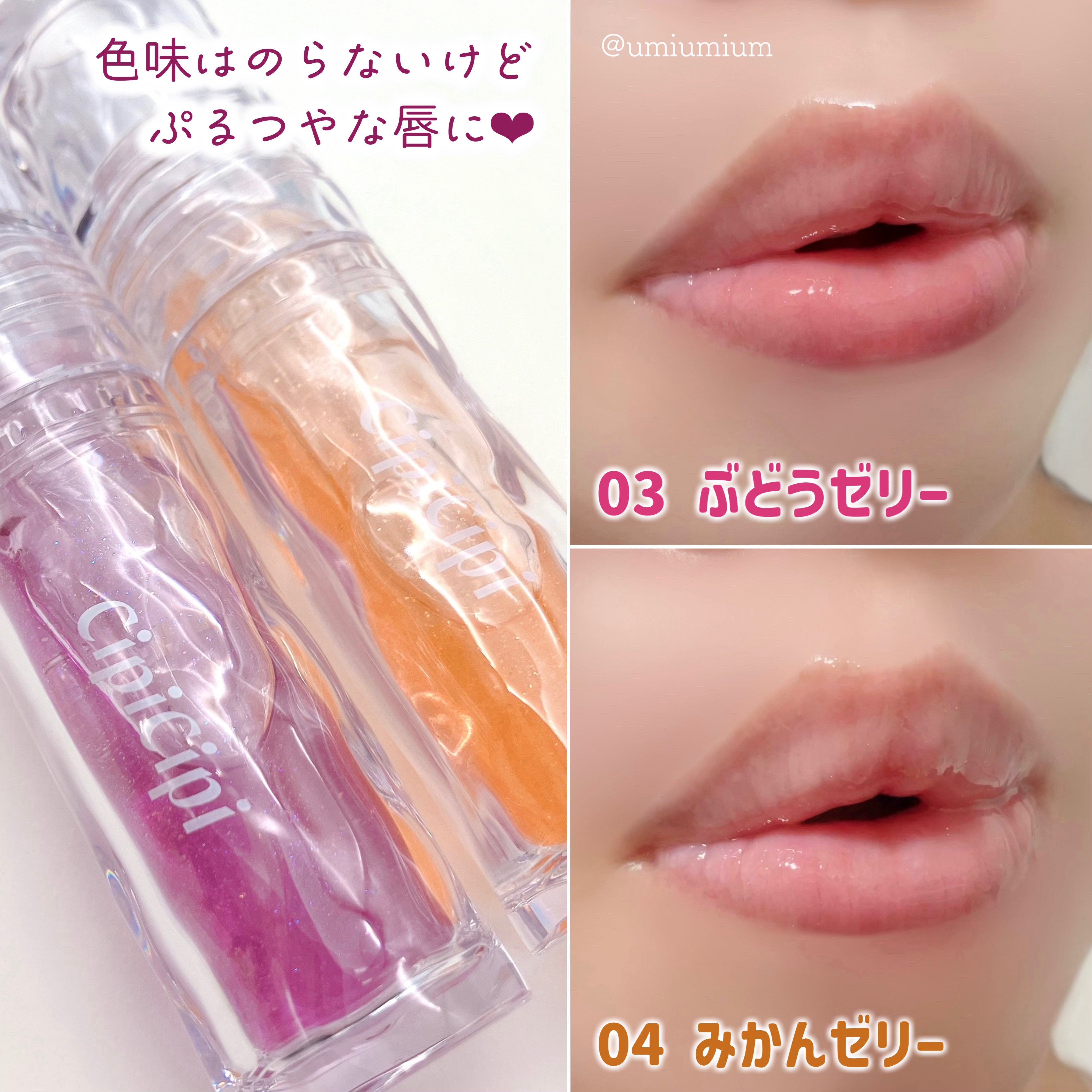 CipiCipiのガラスプランパー既存色も合わせて並べてみるとめちゃくちゃ可愛い…🥹💘 それぞれのカラーに合わせて香りが違うのも好きすぎる…今回の限定新色はしっかりとゴールドラメが入ってるけど、既存色はカラーもラメも控えめなので日常使いにも◎ ぜひ気になった方は、チェックしてみてください🫶🏻️💓