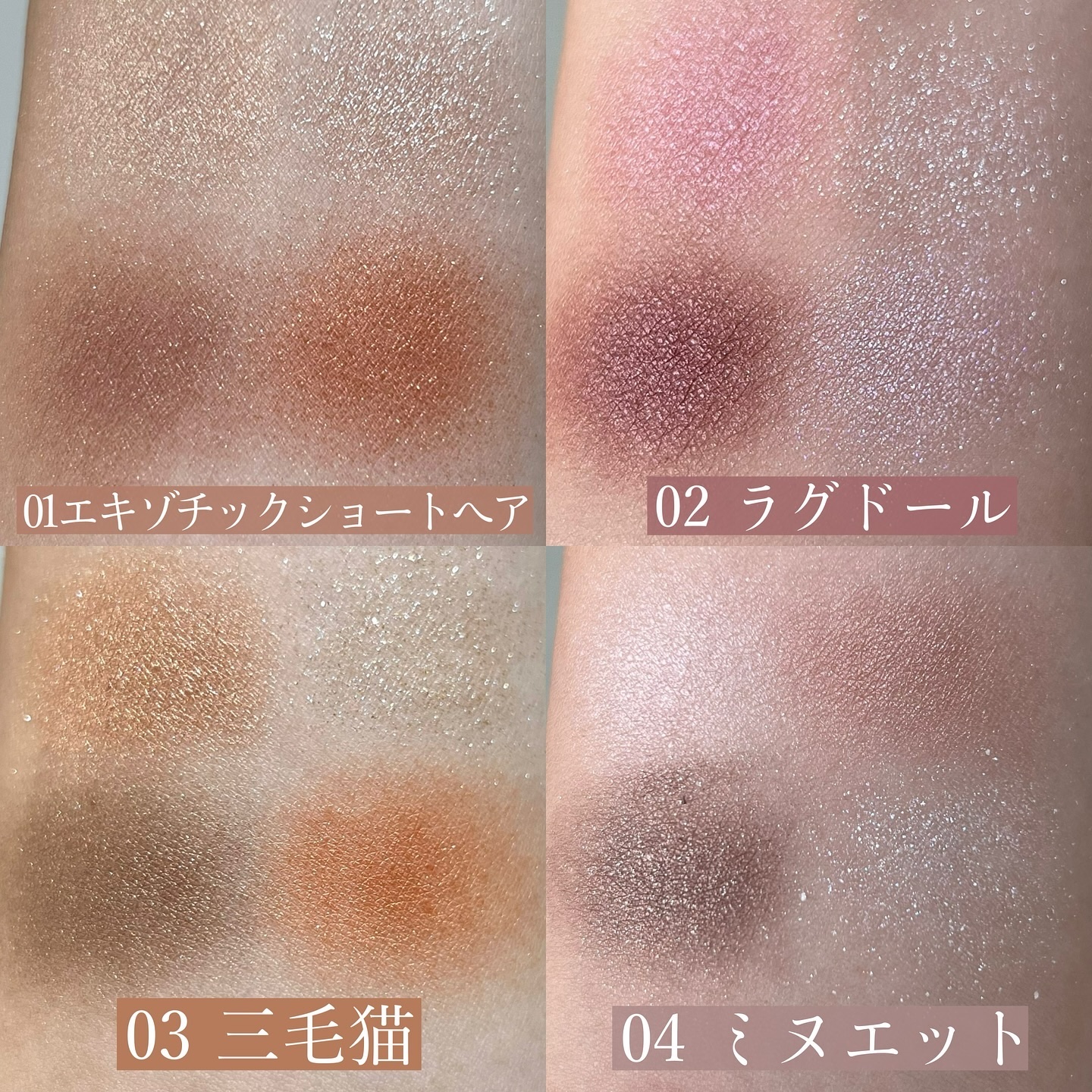 - <01 エキゾチックショートヘア> マイカ、ジメチコン、ホウケイ酸(Ca/Al)、合成フルオロフロゴパイト、酸化チタン、合成ワックス、酸化鉄、パルミチン酸エチルヘキシル、ポリメタクリル酸メチル、ステアリン酸亜鉛、パルミチン酸亜鉛、ポリブテン、ビスジグリセリルポリアシルアジペート-2、フェノキシエタノール、カプリリルグリコール、酢酸トコフェロール、酸化スズ、シリカ、クエン酸 <02 ラグドール> マイカ、ホウケイ酸(Ca/Al)、ジメチコン、合成フルオロフロゴパイト、酸化チタン、酸化鉄、パルミチン酸エチルヘキシル、合成ワックス、ステアリン酸亜鉛、ポリメタクリル酸メチル、パルミチン酸亜鉛、ポリブテン、ビスジグリセリルポリアシルアジペート-2、フェノキシエタノール、マンガンバイオレット、酢酸トコフェロール、カプリリルグリコール、酸化スズ、シリカ、赤226、クエン酸 <03 三毛猫> マイカ、ジメチコン、合成フルオロフロゴパイト、ホウケイ酸(Ca/Al)、酸化チタン、酸化鉄、パルミチン酸エチルヘキシル、合成ワックス、ポリメタクリル酸メチル、ステアリン酸亜鉛、パルミチン酸亜鉛、ポリブテン、ビスジグリセリルポリアシルアジペート-2、フェノキシエタノール、酢酸トコフェロール、カプリリルグリコール、コンジョウ、シリカ、酸化スズ、クエン酸 <04 ミヌエット> マイカ、ジメチコン、合成フルオロフロゴパイト、酸化チタン、酸化鉄、ポリメタクリル酸メチル、ホウケイ酸(Ca/Al)、パルミチン酸エチルヘキシル、合成ワックス、ステアリン酸亜鉛、パルミチン酸亜鉛、ポリブテン、ビスジグリセリルポリアシルアジペート-2、フェノキシエタノール、(ジメチコン/ビニルジメチコン)クロスポリマー、カプリリルグリコール、酢酸トコフェロール、シリカ、酸化スズ、クエン酸 <05 サイベリアン> ホウケイ酸(Ca/Al)、ジメチコン、合成フルオロフロゴパイト、マイカ、ポリメチルシルセスキオキサン、酸化チタン、パルミチン酸エチルヘキシル、シリカ、トリ(カプリル酸/カプリン酸)グリセリル、酸化鉄、リンゴ酸ジイソステアリル、窒化ホウ素、水酸化Al、合成ミツロウ、(ジメチコン/ビニルジメチコン)クロスポリマー、合成ワックス、ミリスチン酸Mg、ポリメタクリル酸メチル、ステアリン酸亜鉛、フェノキシエタノール、オゾケライト、(ビニルジメチコン/メチコンシルセスキオキサン)クロスポリマー、ナイロン-12、パルミチン酸亜鉛、カプリリルグリコール、ポリイソブテン、トリエトキシカプリリルシラン、メチコン、ビスステアリルジメチコン、ビスジグリセリルポリアシルアジペート-2、イソノナン酸イソノニル、黄4、酸化スズ、ビスPEG-18メチルエーテルジメチルシラン、ラウロイルリシン、ジエチルヘキサン酸ネオペンチルグリコール、赤202、ジメチコノール、トコフェロール <06 スコティッシュフォールド> ホウケイ酸(Ca/Al)、マイカ、シリカ、合成フルオロフロゴパイト、トリ(カプリル酸/カプリン酸)グリセリル、リンゴ酸ジイソステアリル、酸化鉄、窒化ホウ素、パルミチン酸エチルヘキシル、酸化チタン、ホウケイ酸(Ca/Na)、ミリスチン酸Mg、水酸化Al、合成ワックス、ジメチコン、合成ミツロウ、ナイロン-12、フェノキシエタノール、オゾケライト、トリエトキシカプリリルシラン、メチコン、イソノナン酸イソノニル、カプリリルグリコール、ビスステアリルジメチコン、(ジメチコン/ビニルジメチコン)クロスポリマー、ラウロイルリシン、ビスPEG-18メチルエーテルジメチルシラン、酸化スズ、ジエチルヘキサン酸ネオペンチルグリコール、ジメチコノール、トコフェロール <07 アメリカンショートヘア> タルク、マイカ、窒化ホウ素、合成フルオロフロゴパイト、酸化チタン、シリカ、ホウケイ酸(Ca/Al)、ポリメタクリル酸メチル、ナイロン-12、ミリスチン酸Mg、トリ(カプリル酸/カプリン酸)グリセリル、合成ワックス、イソノナン酸イソノニル、酸化鉄、パルミチン酸エチルヘキシル、リンゴ酸ジイソステアリル、フェニルトリメチコン、ジメチコン、トリエトキシカプリリルシラン、オキシ塩化ビスマス、フェノキシエタノール、ラウロイルリシン、カプリリルグリコール、水酸化Al、メチコン、酸化スズ、酢酸トコフェロール、赤202、アルミナ、青1、黄4