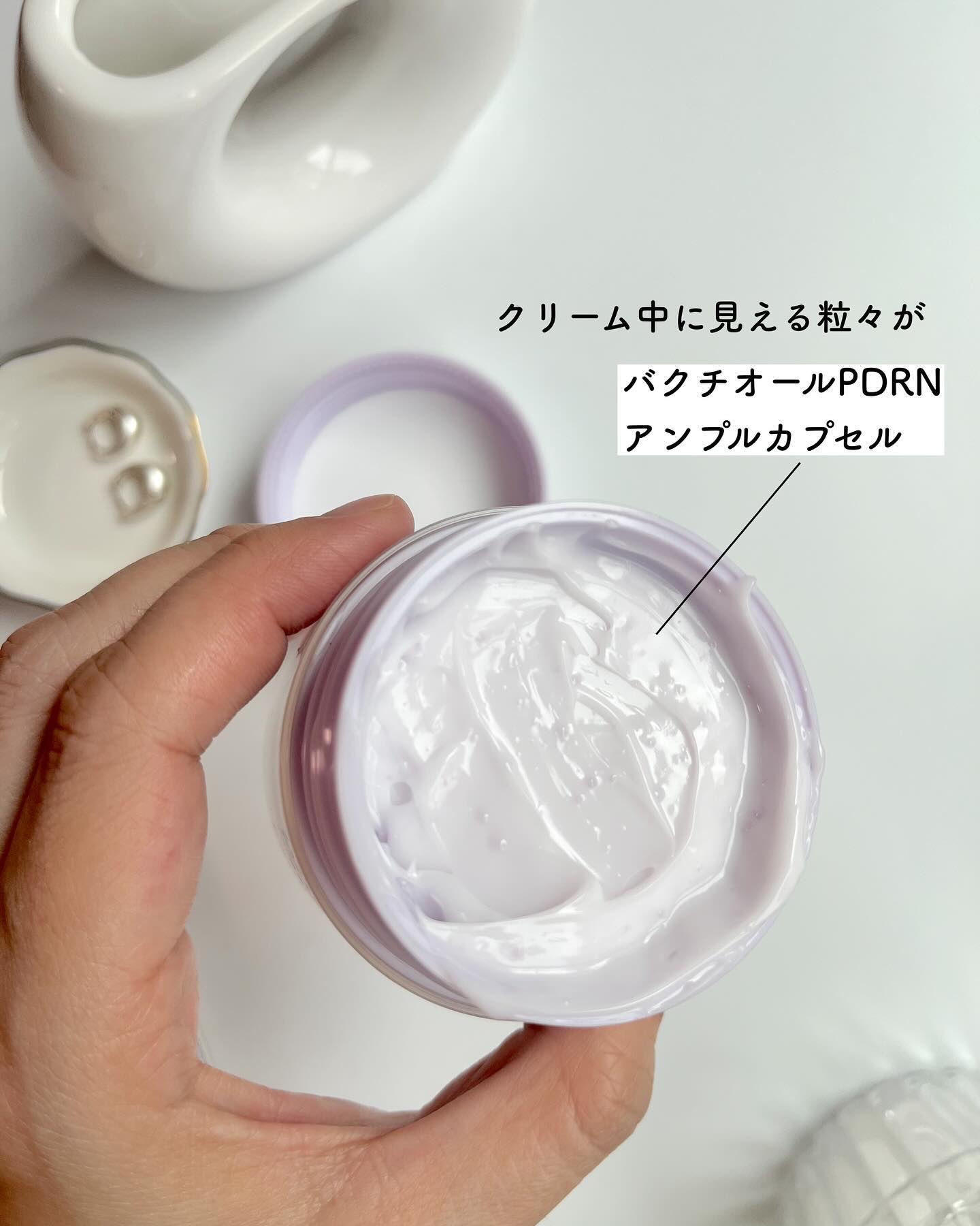 独自成分のバクチオールPDRN配合! ベタつかず、重くならない使用感! 低刺激だけど高機能という守りつつの攻めのケア🙋♀️💕 淡いパープルのパケがあまり見ない感じで個人的には可愛い💜