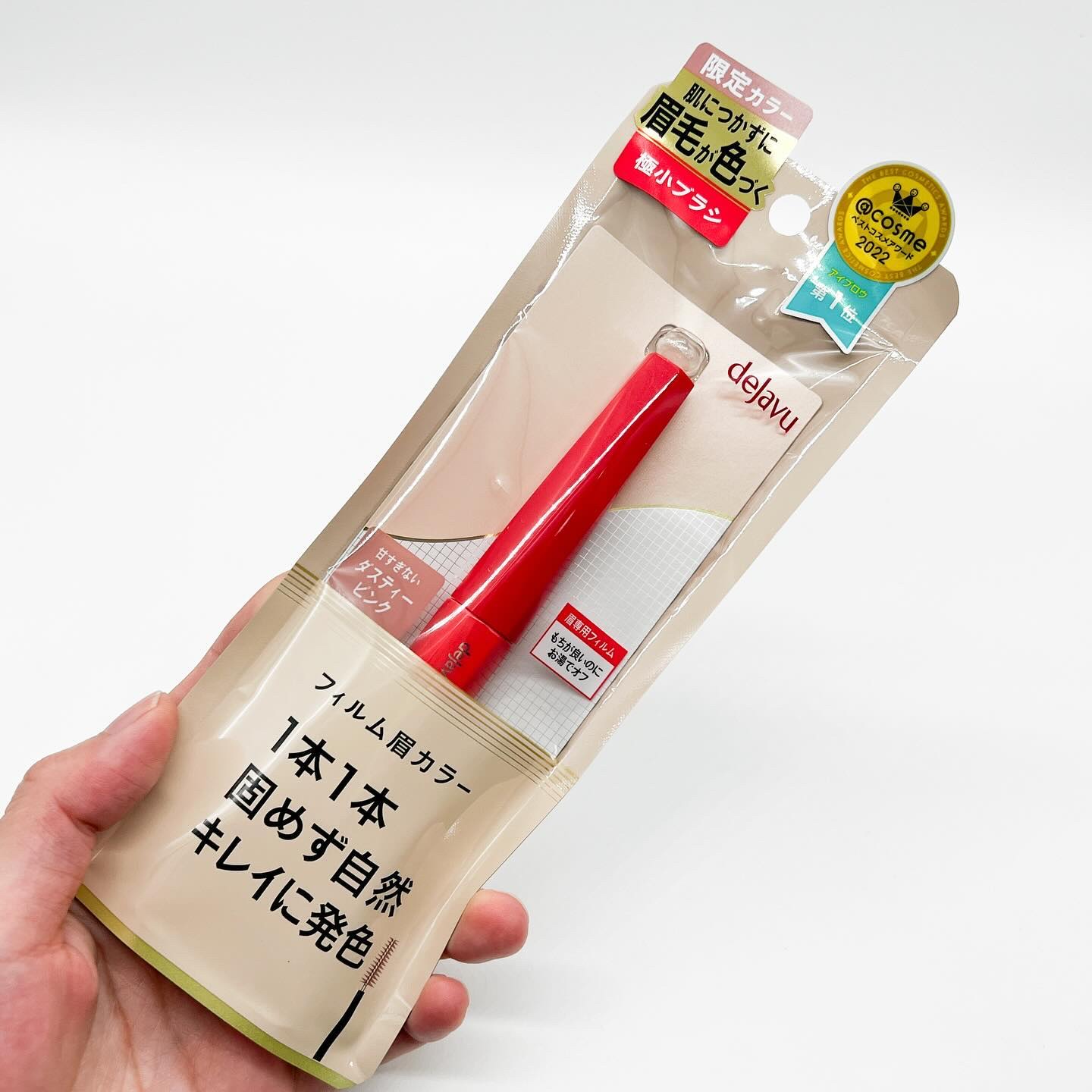 - \\25年3月定番新色モカグレージュ発売// 「フィルム眉カラー」なら眉の印象を自然にやわらげ、ふんわり質感の垢抜け眉に! 1.塗りやすい極小ブラシ ・ 先端直径3mmで、地肌に液がつきにくく根元から色づける ・余分な液がつかない設計で、ティッシュオフ不要 2.眉専用フィルム液 ・眉毛1本1本にキレイに色付き、自眉の黒さをやわらげる ・タバになったり、パリッと固まったりせず、まるで自眉のような仕上がり ・皮脂・汗・こすれに強いのにお湯で簡単オフ (※2025年9月以降、商品パッケージをリニューアル。) デジャヴュ アイブロウカラー