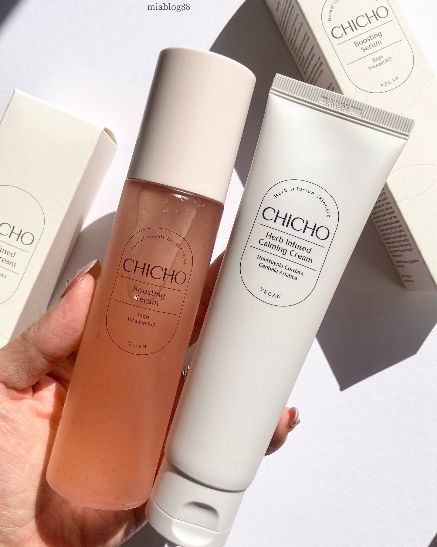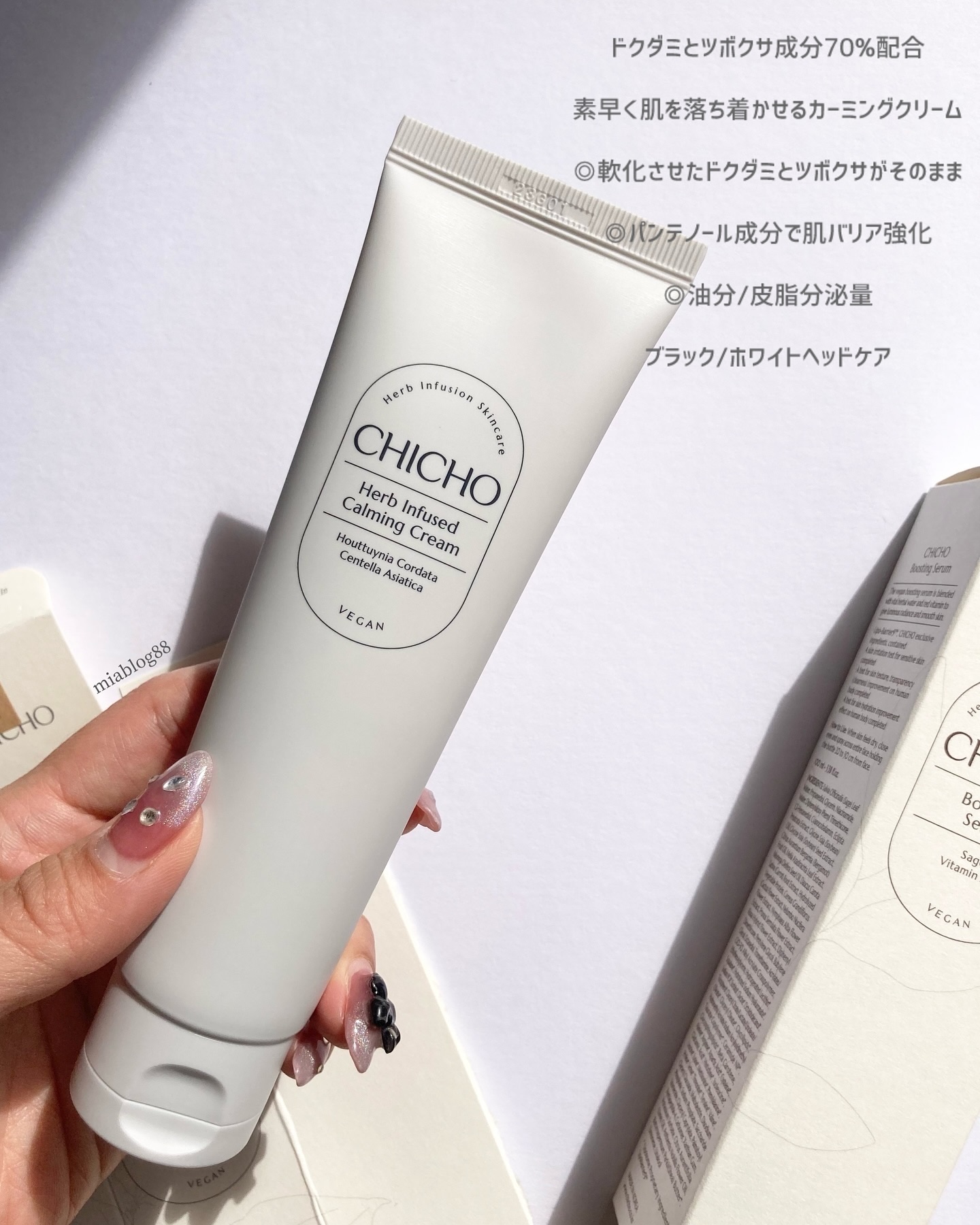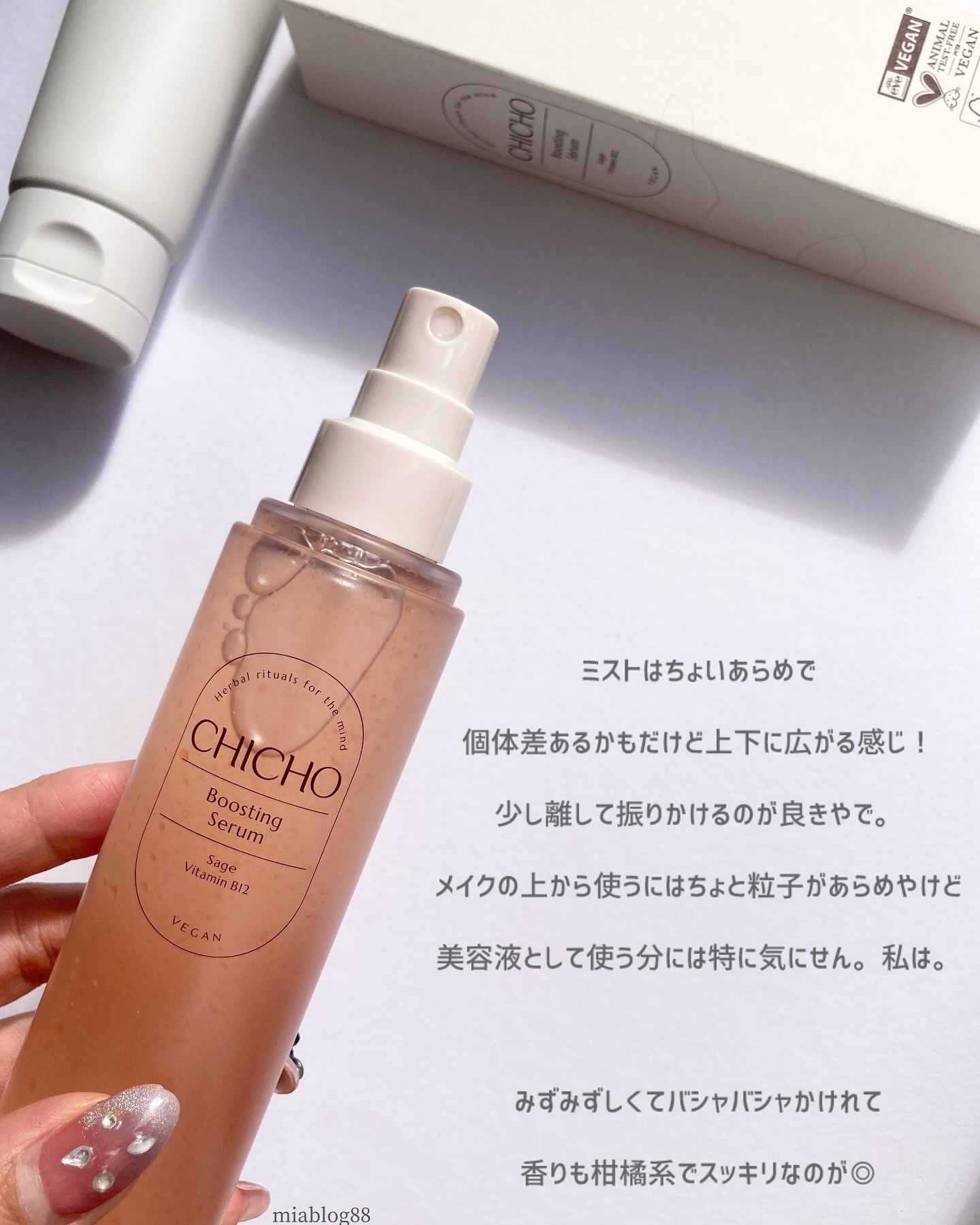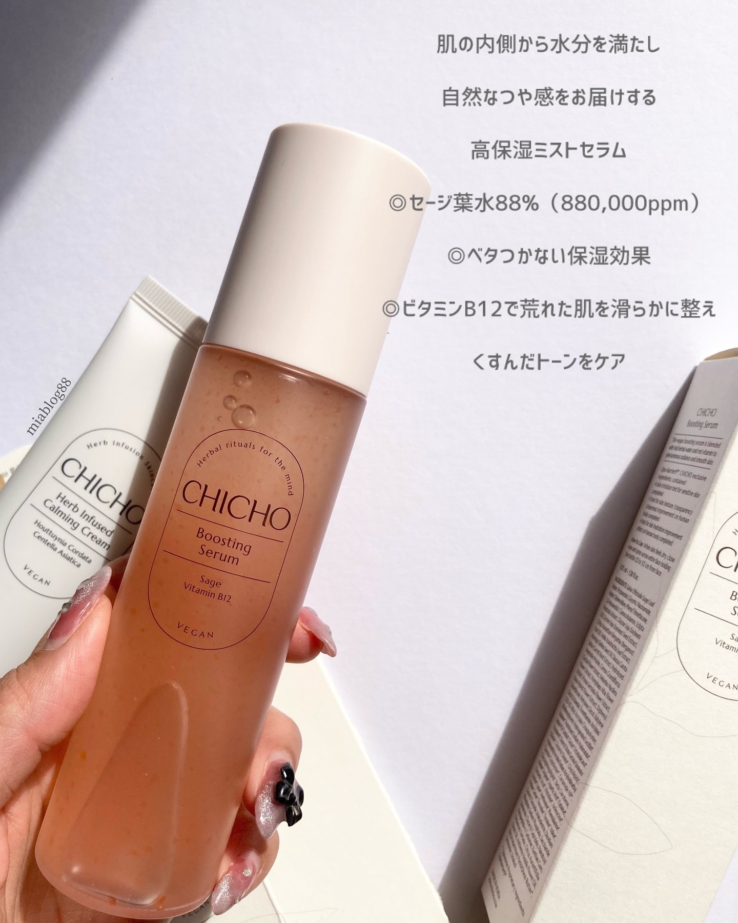 CHICHO は肌に塗るハーブの意味が込められたヴィーガンブランド❣️ 自然なツヤ感にしてくれる高保湿ミストセラム✨肌の鎮静に特化しているセージ葉水を88%含有♡ 成分の70%を占めるドクダミとツボクサ🌿.∘ スッキリ系の優しいハーブの香りがいい😌🤍