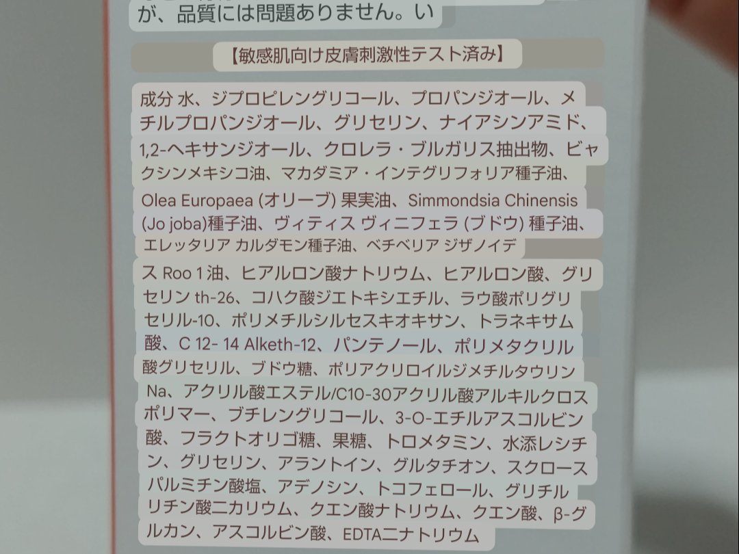 低分子ヒアルロン酸、コラーゲン、ガラクトミセス、サッカロミセス、グリチルリチン酸ジカリウム、アズレン、キシリトール、ビタミンC誘導体、バクチオール 高濃度ビタミンC(20%越えるとぴりぴりする)、高濃度ナイアシンアミド(10%越えるとぴりぴりする)、レチノール(毎回A反応がひどい)、ヘパリン類似物質(赤みが悪化する)、針(痛いしかぶれる) 植物系エキスは濃度や抽出法で違いが出そうなので入れてません 同じ植物のエキスでもめちゃくちゃしみるのがある😢
