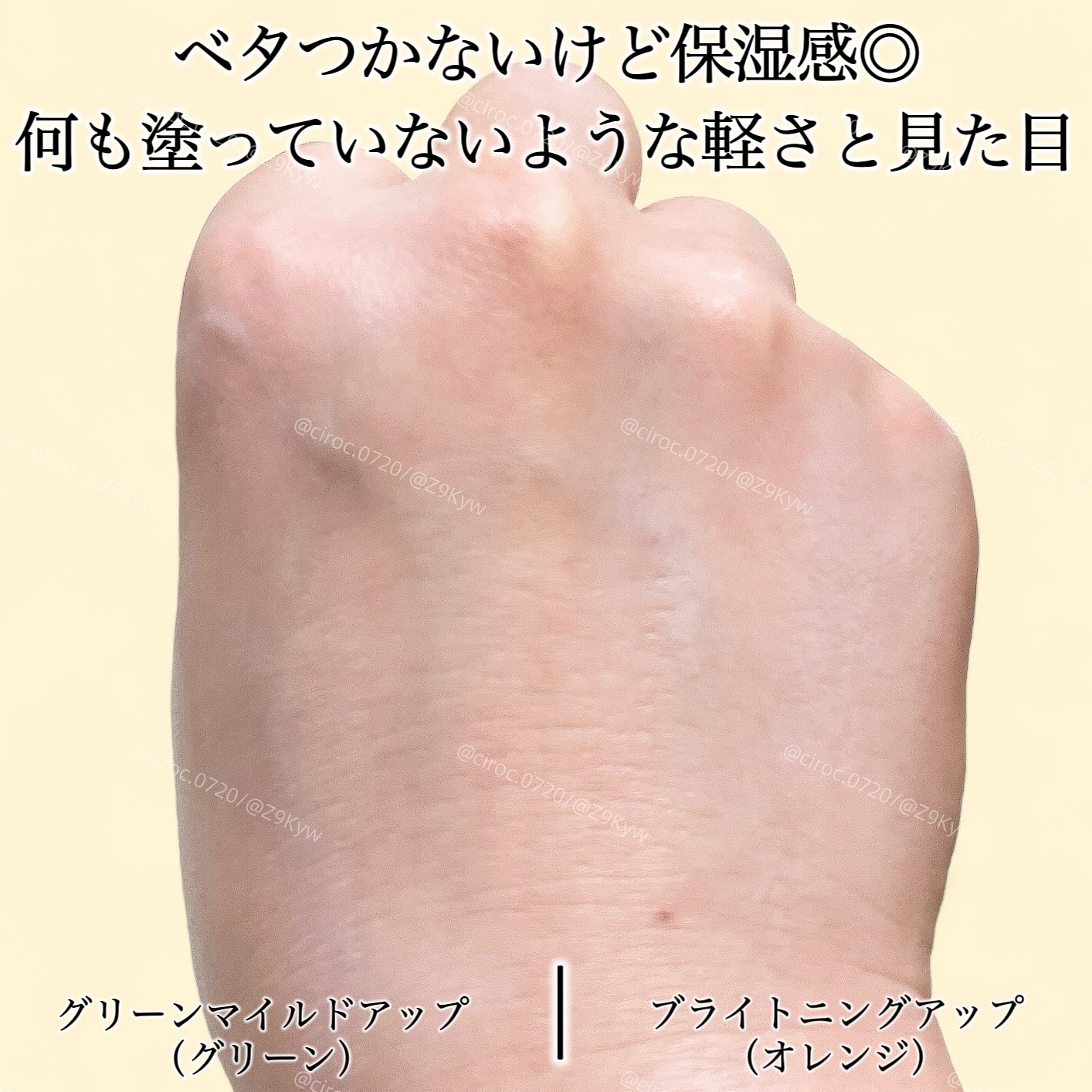 トーンアップ下地兼日焼け止め🧡 ピーチ色ベースのカラーで、べたつかず伸びがいいテクスチャーです! サラッとした仕上がりでメイクの前にも使いやすいです✨ ブライトニングアップは肌なじみがいいカラーです🧡 グリーマイルドアップは白色なので自然に明るくなる印象でした💚