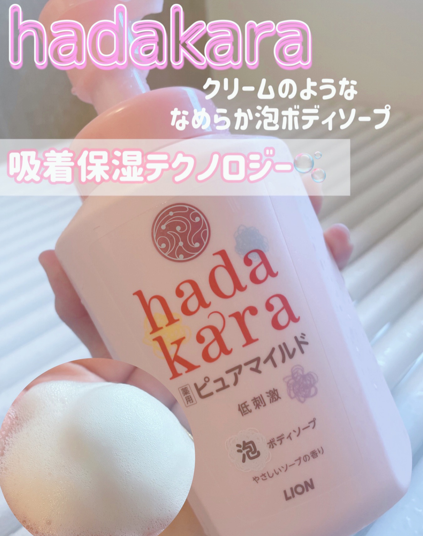 - 保湿成分が洗い流されない(※)ボディソープ「hadakara」。 肌に吸いつく濃密な泡のパックが、汚れは落とし、 保湿成分が肌にしっかり吸着します。 洗うたびうるおいを与え、柔らかな素肌へ。 *当社比