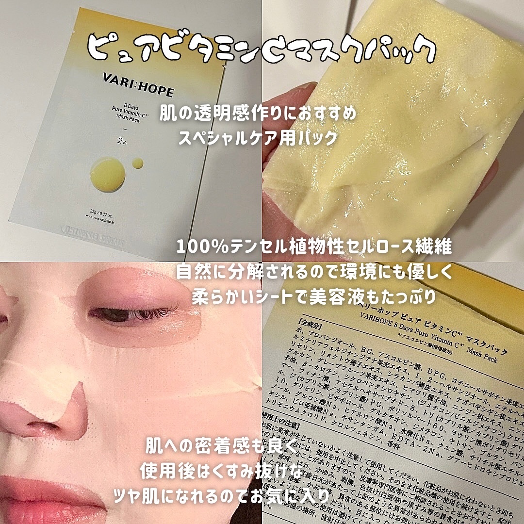 VARIHOPE(@varihope_jp )の白玉セットをお試しさせて頂きました💕 #8デイズピュアビタミンc美容液 #8デイズピュアビタミンcクリーム #8デイズピュアビタミンcマスクパック (5枚入) のセットに、ポーチ、洗顔がおまけでついてくるよ!!お得すぎる!! 水ベースのピュアビタミンC*1配合の美容液。トロッとしたテクスチャーだけど伸びも良くて浸透も早かった!!韓国で累計200万本以上累計販売のある人気美容液!! ビタミンC美容液たっぷり入ってるマスクパック! これさ、クリームの次に使用するのよ!