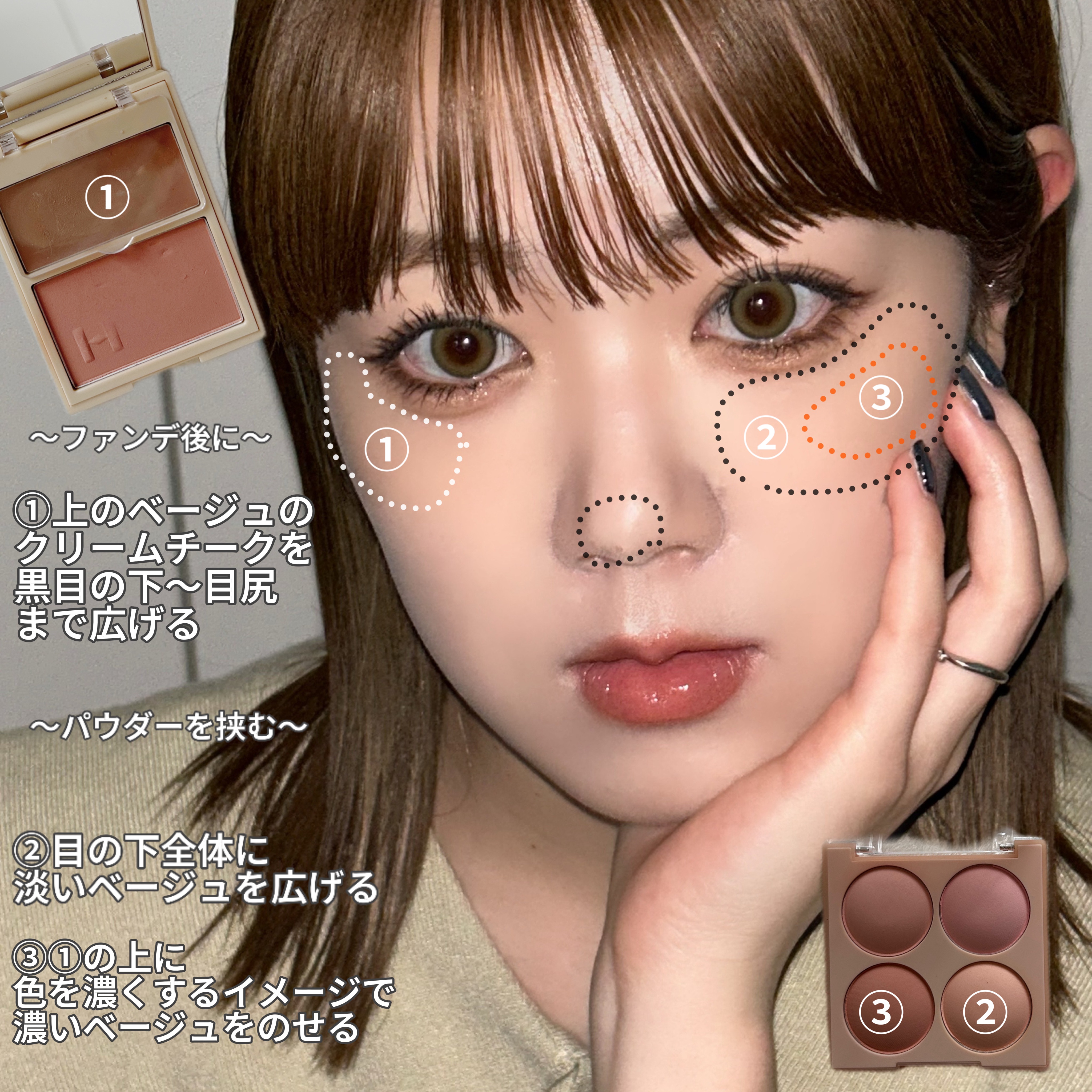 アイシャドウは色味が唯一無二で持ってるだけでおしゃれ気分になれます🧸 発色もとてもいいので調整次第でいろんなメイクができますね! チークはレイヤリングとあるように重ねて使うんですが、オススメの使い方は 1️⃣ファンデの後にクリームチークを少し濃いめに入れる 2️⃣フェイスパウダーをその上に重ねて、その後パウダー状のチークを重ねる こうするとじゅわっとした血色感が演出できて 塗りすぎ感も出ず良かったです◎