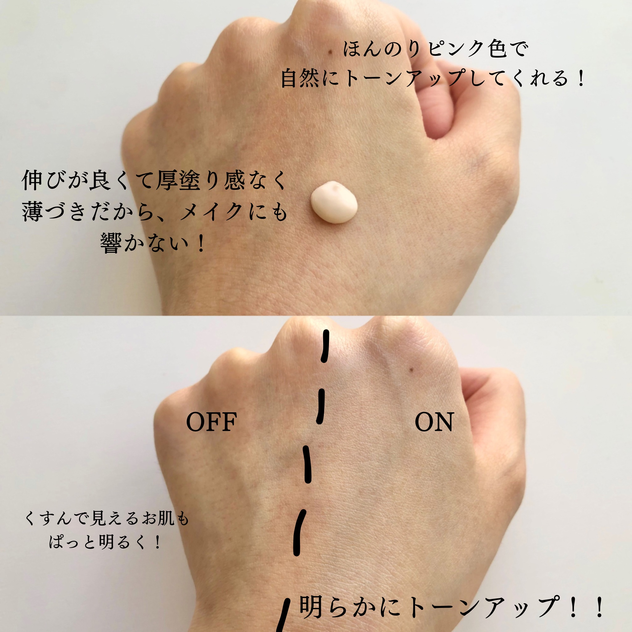 - SPF50+ PA++++ グルタチオン*やナイアシンアミド*が入った、スキンケア効果の高い、化粧下地としても使える日焼け止めです。 さらに、ヒアルロン酸*も入っているので、水分ケアまで可能!冬場でも、長時間乾燥が気になりにくい! スキンケアで肌を潤わしながら、日焼け対策もでき、化粧下地としてベースを整えてくれます。 しっとりとしたテクスチャーですが、仕上がりはベタっとせず、肌の角質層を潤わせるので、メイクの密着力を高め、長時間潤いを感じます。 ほんのりピンクがかった色で、肌に高級感と多幸感を演出してくれます。 *整肌成分